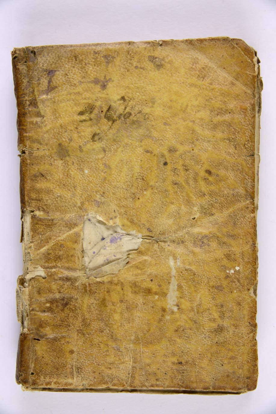 Legatura in piena pergamena floscia, dorso parzialmente lacunoso, 2 carte di guardia ant. e post., mm. 150x100x20, ex libris della Biblioteca sul verso del piatto anteriore. Esemplare privo del bifoglio χ, nota di possesso al recto della prima c. di guardia ant.: hic liber est meus qui vocor Aloisius Giordano, nota di possesso al recto della seconda c. di guardia ant. resa illeggibile da cancellature, due note di possesso al frontespizio: ex libris meis D. Iacinti Bonhomo Nicosia emitt. 15 e Revellato. Prove di penna e conti al recto del piatto ant., al v. della II c. di guardia post. e al recto del piatto posteriore, timbri della Biblioteca al frontespizio e alle cc. A7r e R8r. Numero d’inventario 543681 a c. R8r, provenienza: Agatino Di Benedetto.