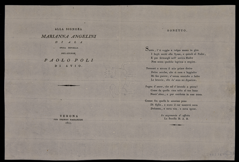 | Alla signora Marianna Angelini di Ala sposa novella del signor Paolo Poli di Avio, sonetto |