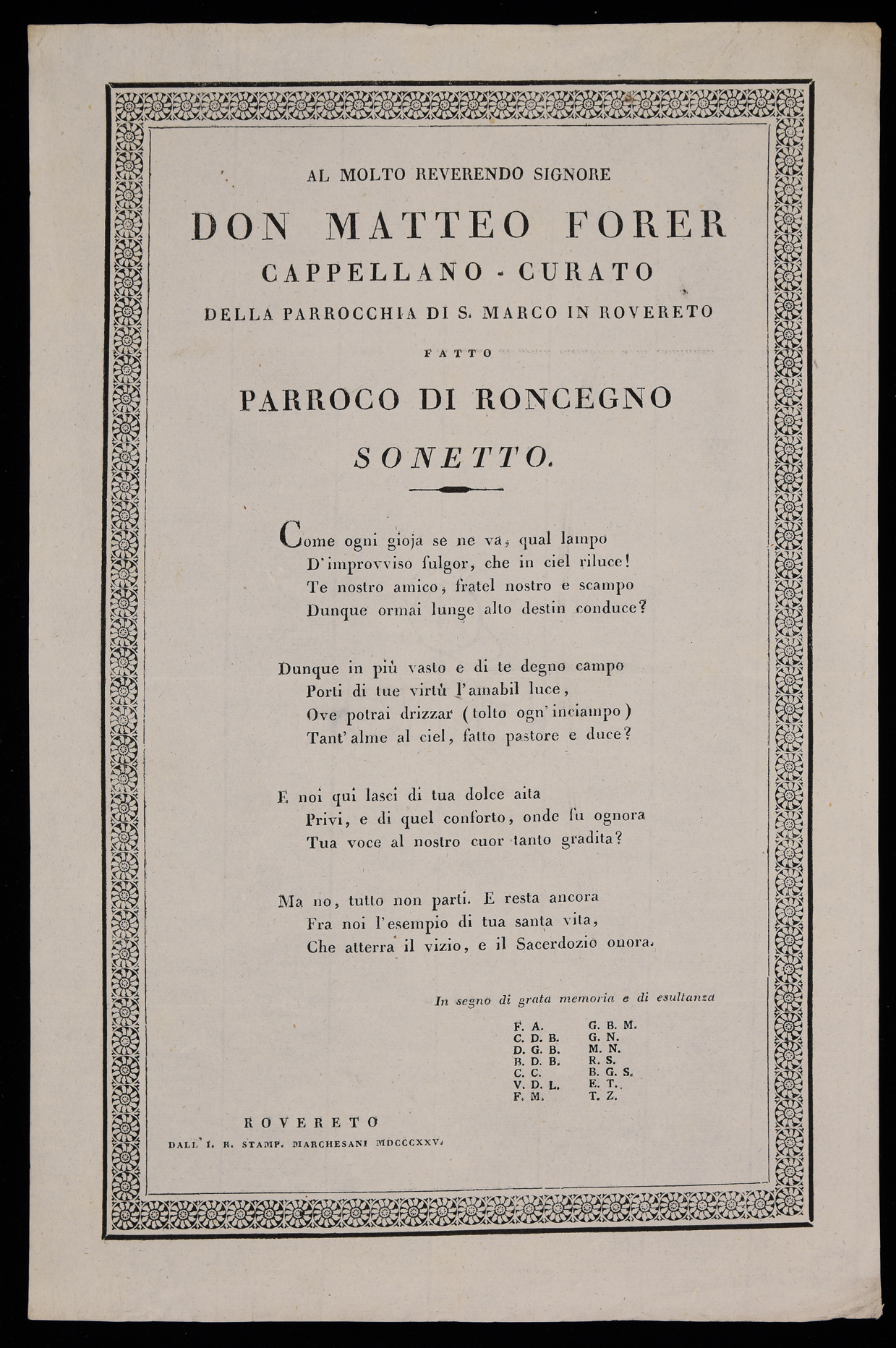 | Al molto reverendo signore don Matteo Forer cappellano-curato della parrocchia di S. Marco in Rovereto fatto parroco di Roncegno, sonetto |