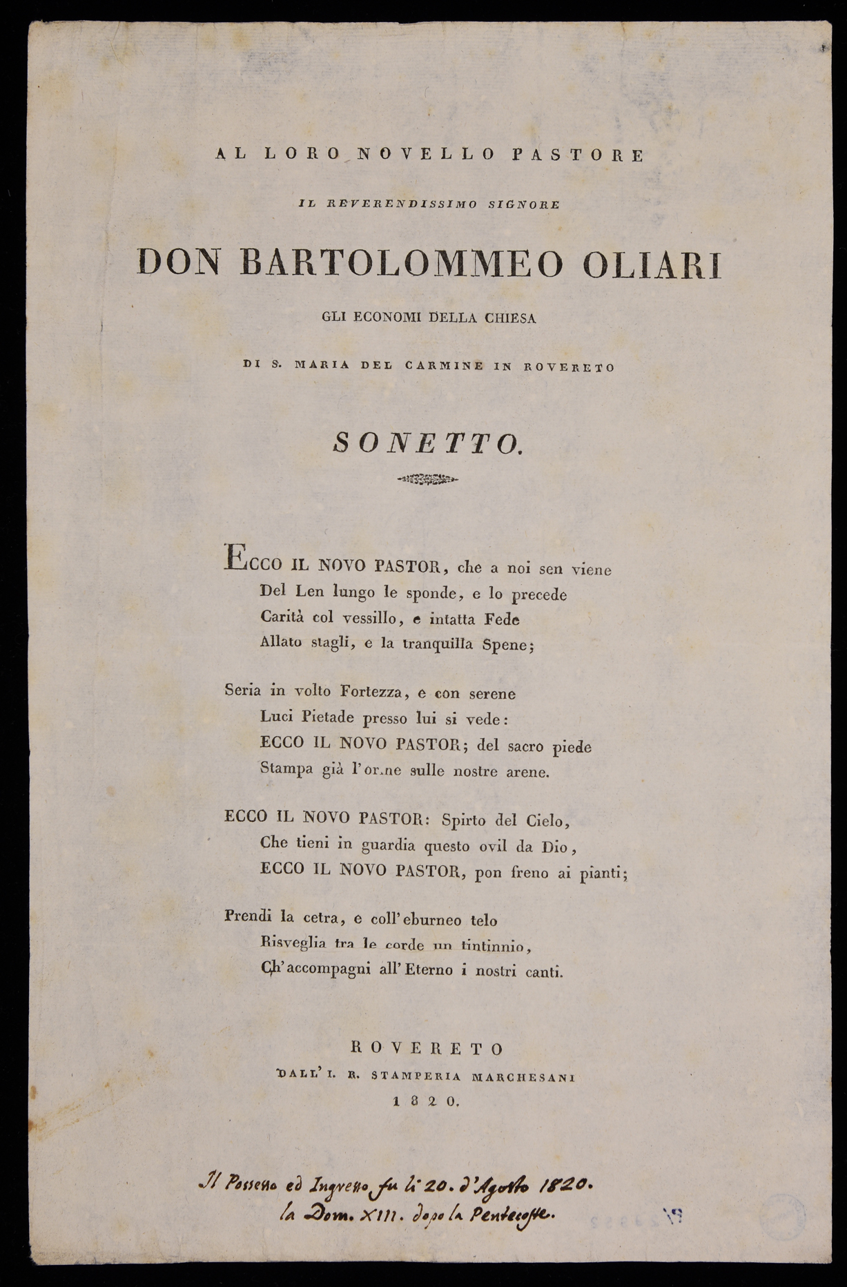 | Al loro novello pastore il reverendissimo signore don Bartolomeo Oliari, gli economi della chiesa di S. Maria del Carmine in Rovereto, sonetto |