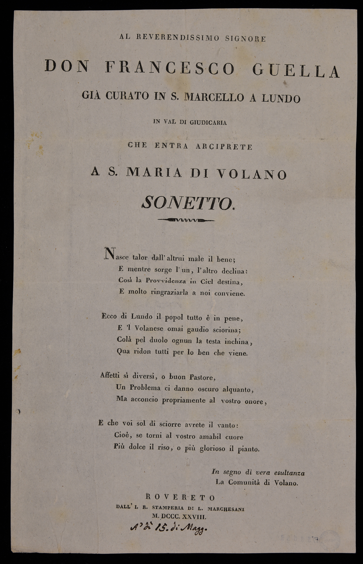 | Al reverendissimo signore don Francesco Guella già curato in S. Marcello a Lundo in Val di Giudicaria che entra arciprete a S. Maria di Volano, sonetto |