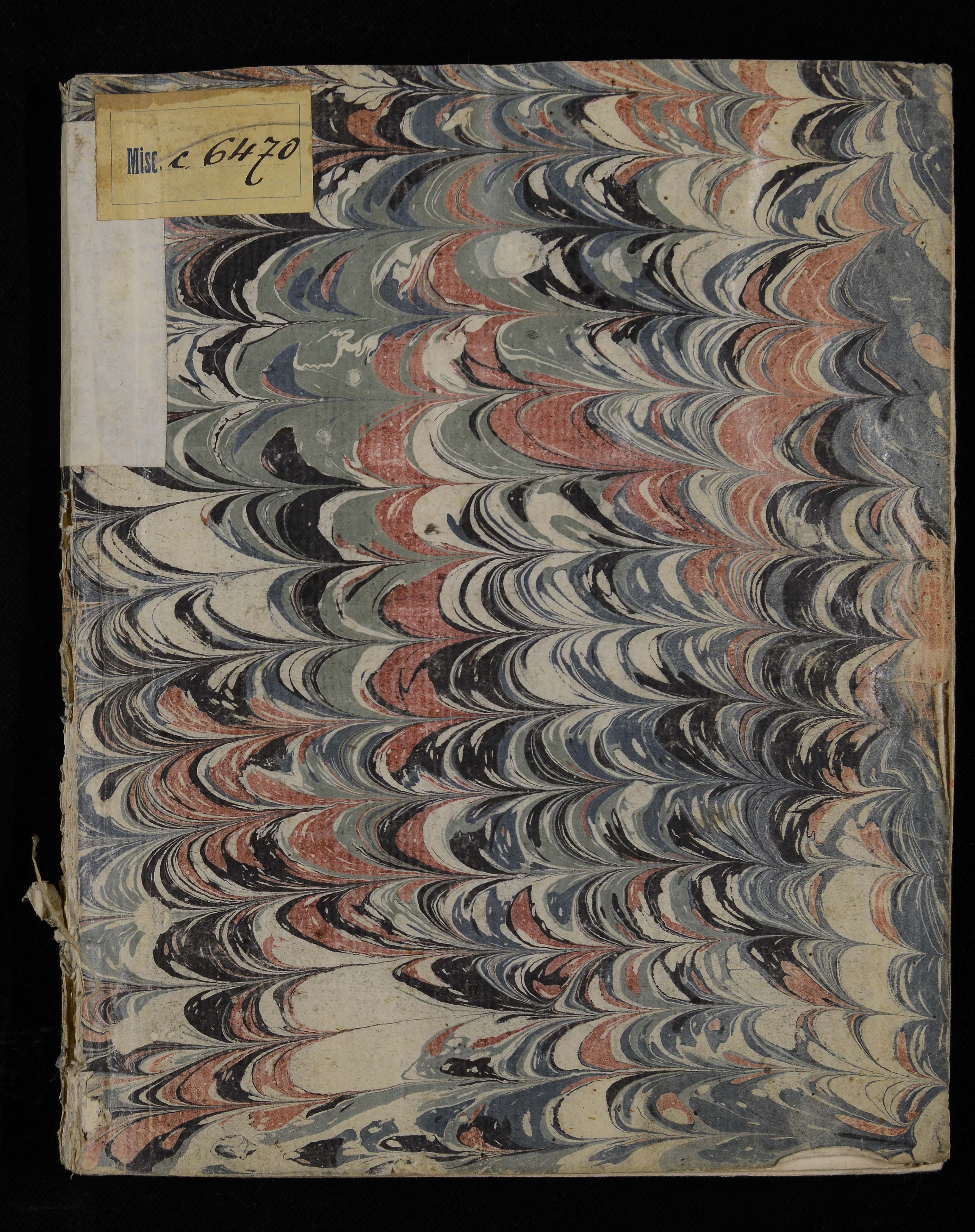 Legatura in carta decorata del XIX sec., 207x342x10 mm. Precedenti segnature di collocazione: I 8 d 28 (cassato), I […] 44 (cassato) 55, 8307/5, Misc. C 6470.