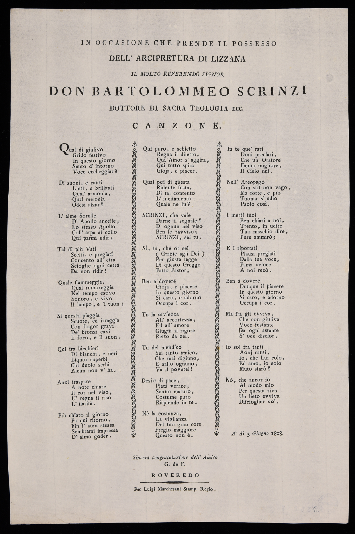 | In occasione che prende il possesso dell'arcipretura di Lizzana il molto reverendo signor Don Bartolomeo Scrinzi dottore di sacra teologia ecc., canzone |