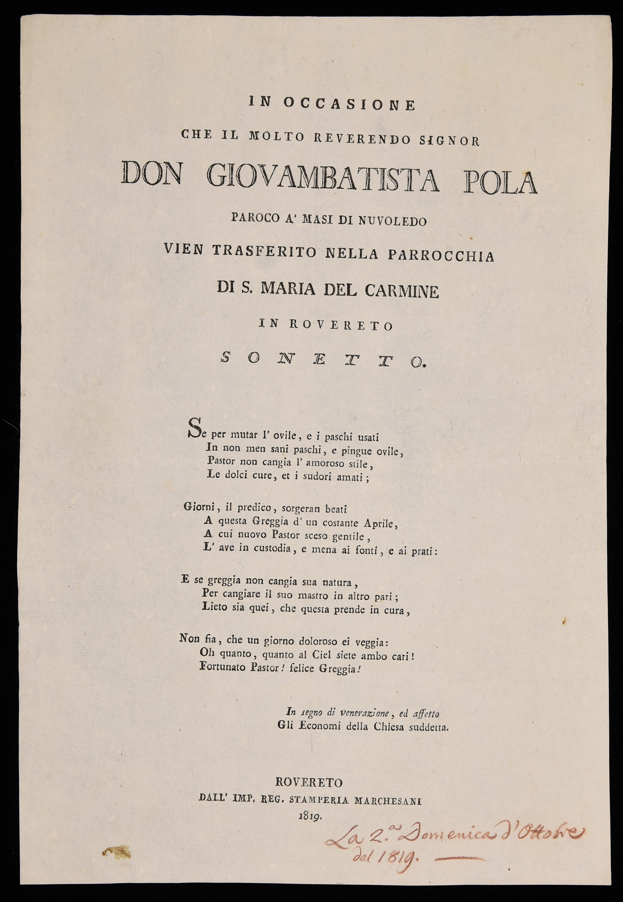| In occasione che il molto reverendo signor don Giovambatista Pola, paroco a Masi di Nuvoledo, vien trasferito nella parrocchia di s. Maria del Carmine in Rovereto, sonetto |