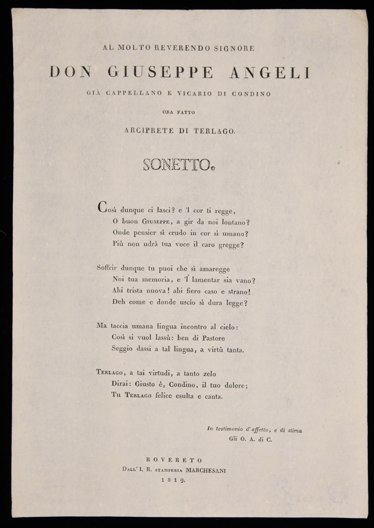 | Al molto reverendo signore don Giuseppe Angeli, già cappellano e vicario di Condino ora fatto arciprete di Terlago, sonetto |
