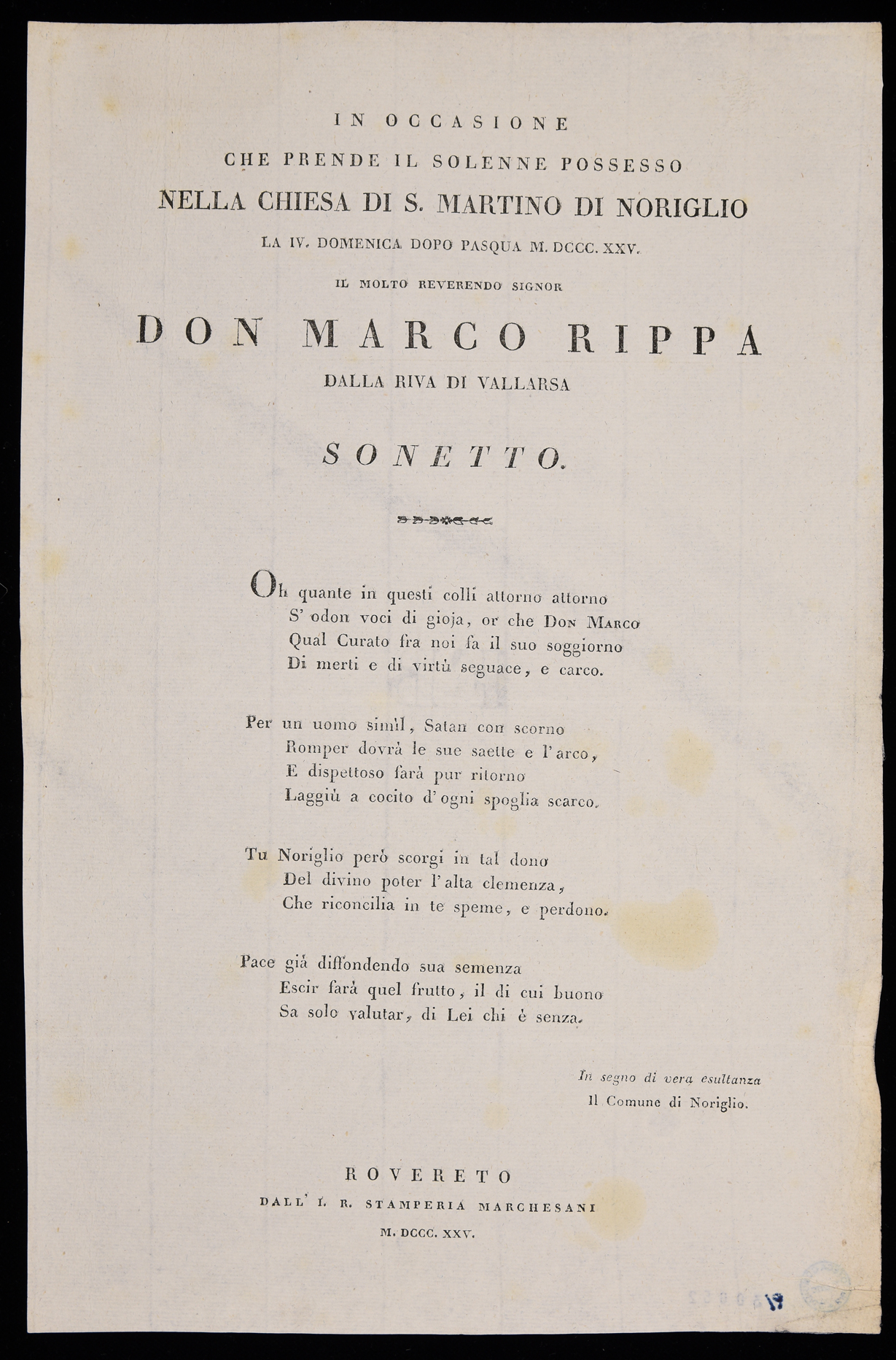 | In occasione che prende il solenne possesso nella chiesa di S. Martino di Noriglio la IV domenica dopo Pasqua MDCCCXXV il molto reverendo signor don Marco Rippa dalla Riva di Vallarsa, sonetto |
