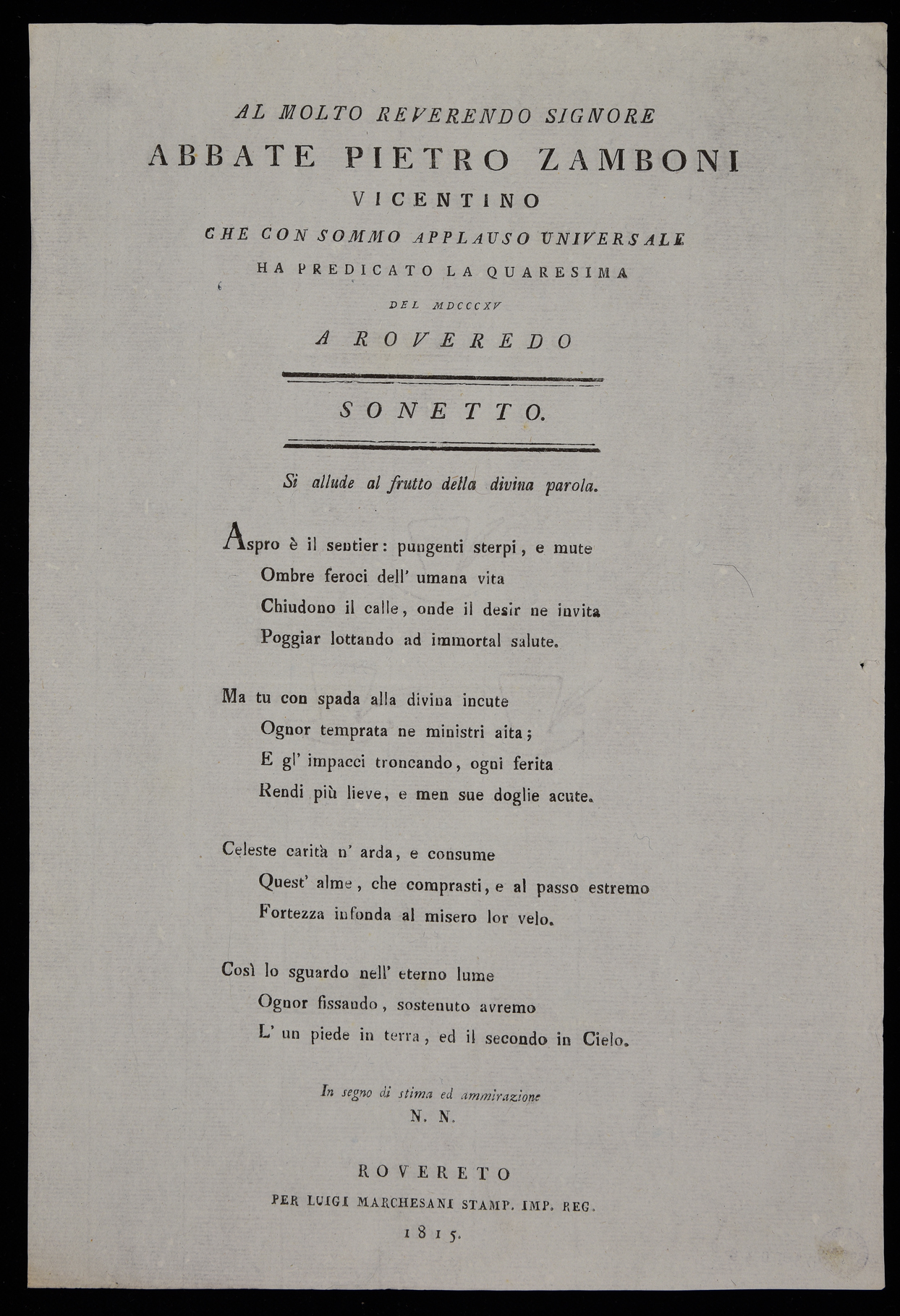 | Al molto reverendo signore abbate Pietro Zamboni vicentino che con sommo applauso universale ha predicato la quaresima del MDCCCXV a Roveredo, sonetto |