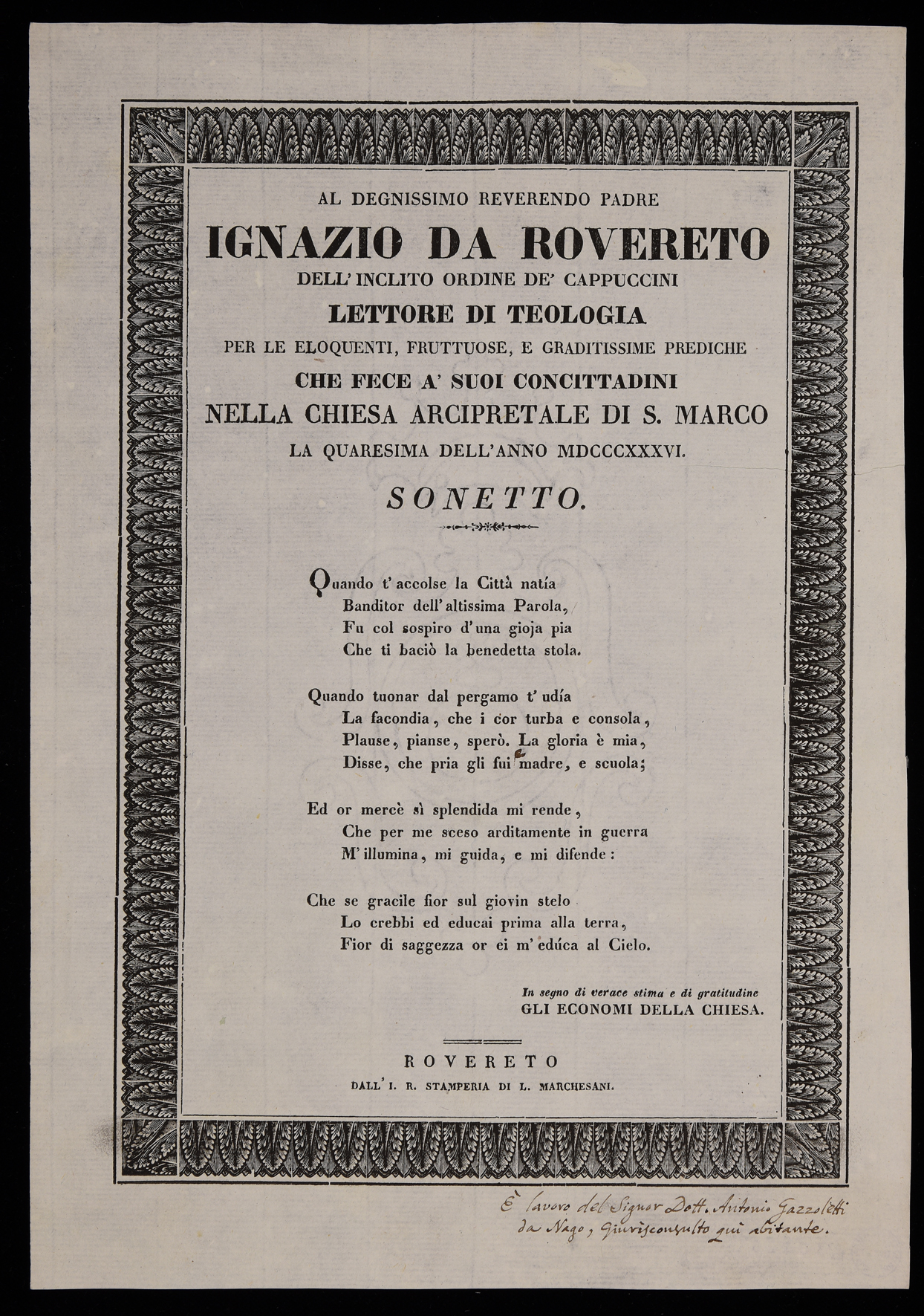 | Al degnissimo reverendo padre Ignazio da Rovereto dell'inclito ordine de' Cappuccini lettore di teologia per le eloquenti fruttuose e graditissime prediche ... |