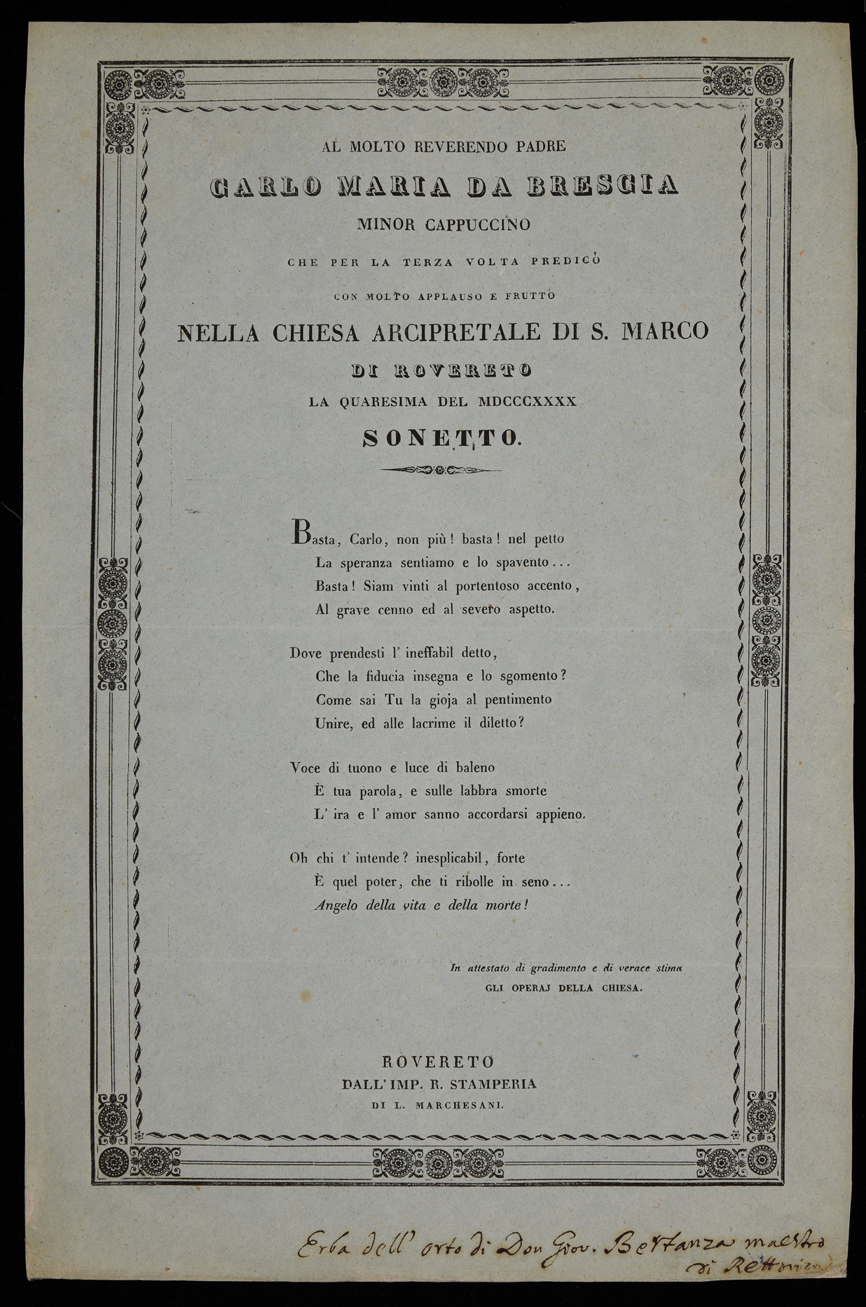 | Al molto reverendo padre Carlo Maria da Brescia Minor Cappuccino che per la terza volta predicò con molto applauso e frutto nella chiesa arcipretale di S. Marco di Rovereto la quaresima del MDCCCXXXX, sonetto |