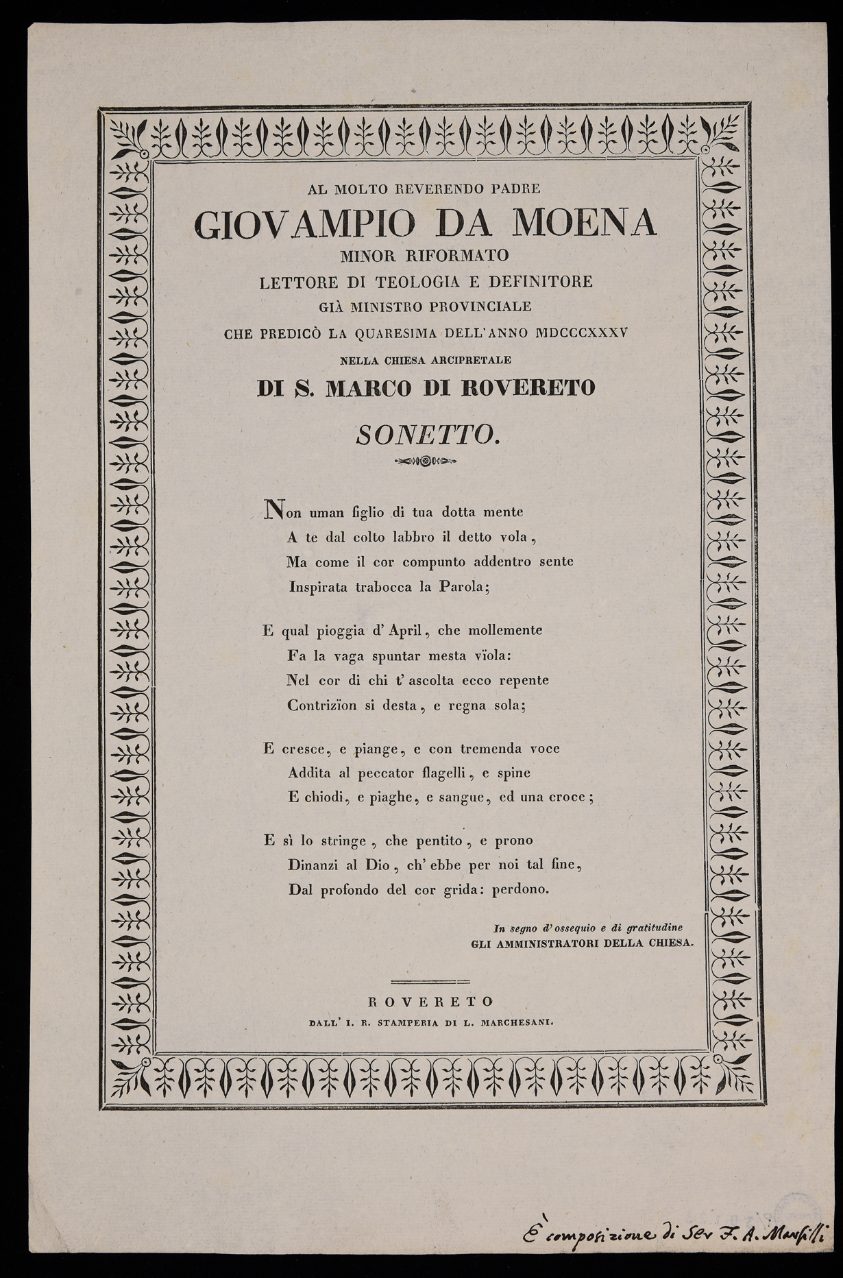 | Al molto reverendo padre Giovampio da Moena, minor riformato lettore di teologia e definitore già ministro provinciale che predicò la quaresima dell'anno MDCCCXXXV nella chiesa arcipretale di S. Marco di Rovereto, sonetto |