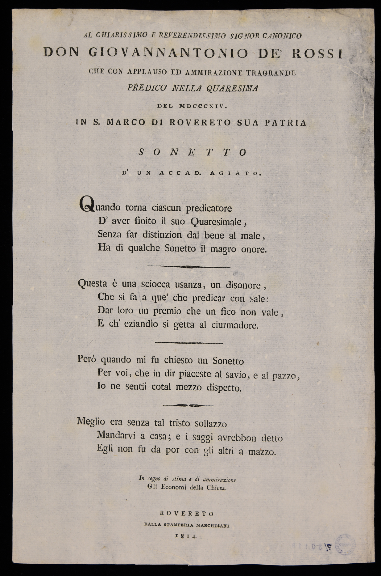 | Al chiarissimo e reverendissimo signor canonico don Giovannantonio de' Rossi che con applauso ed ammirazione tragrande predicò nella quaresima del MDCCCXIV in S. Marco di Rovereto sua patria, sonetto |