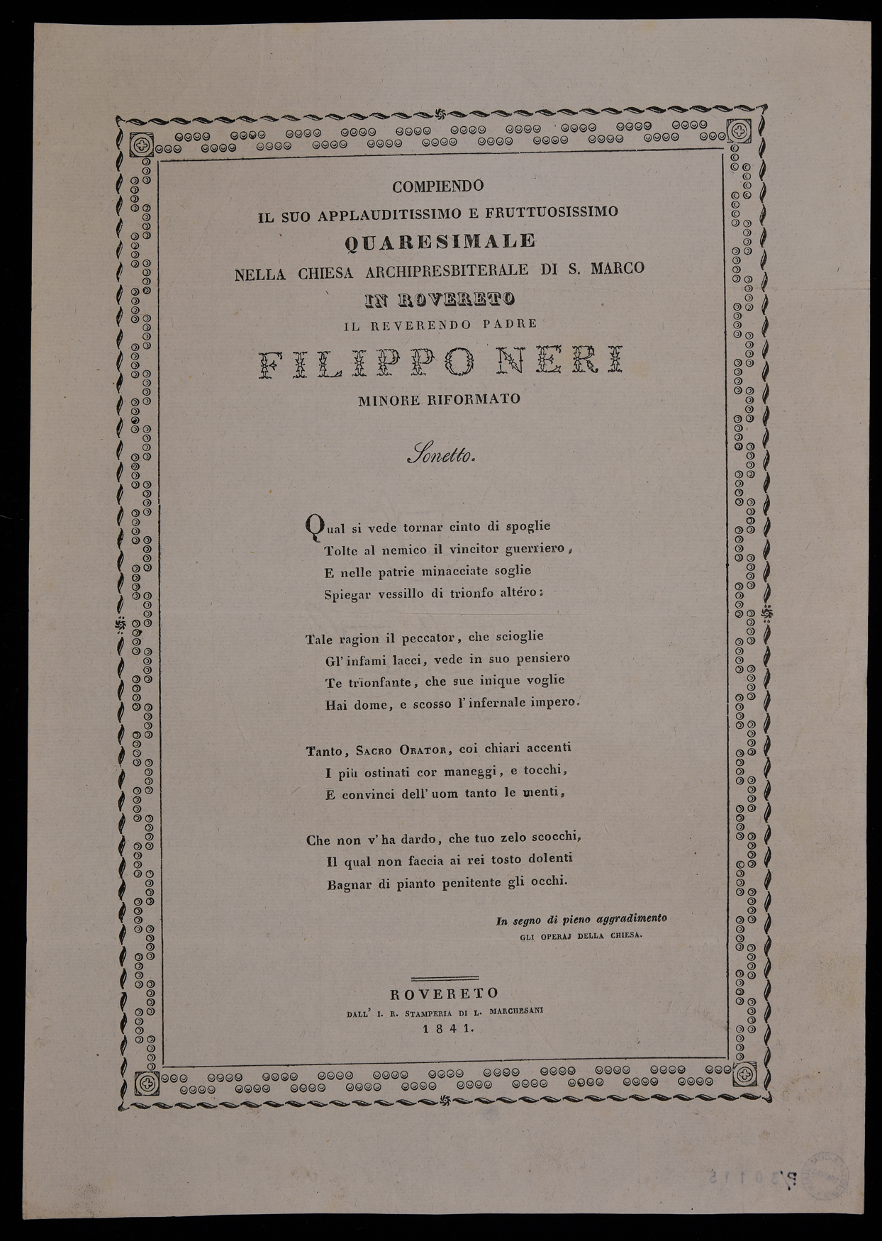 | Compiendo il suo applauditissimo e fruttuosissimo quaresimale nella chiesa archipresbiterale di S. Marco in Rovereto il reverendo padre Filippo Neri minore riformato, sonetto |
