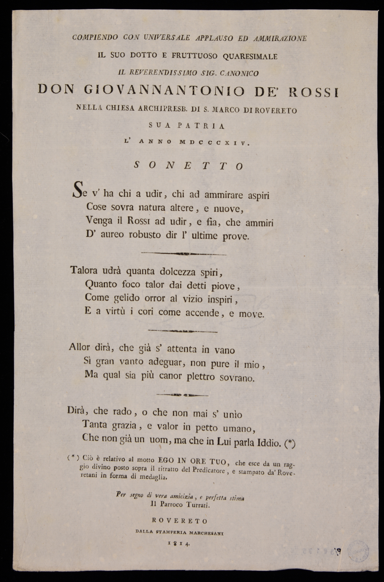 | Compiendo con universale applauso ed ammirazione il suo dotto e fruttuoso quaresimale il reverendissimo sig. canonico da Giovannantonio de' Rossi nella chiesa archipresb. di S. Marco di Rovereto sua patria ... |
