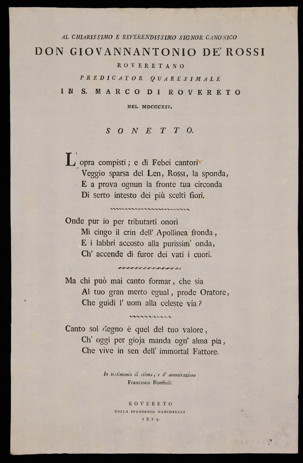 | Al chiarissimo e reverendissimo signor canonico don Giovannantonio de' Rossi roveretano predicator quaresimale in S. Marco di Rovereto nel MDCCCXIV, sonetto |