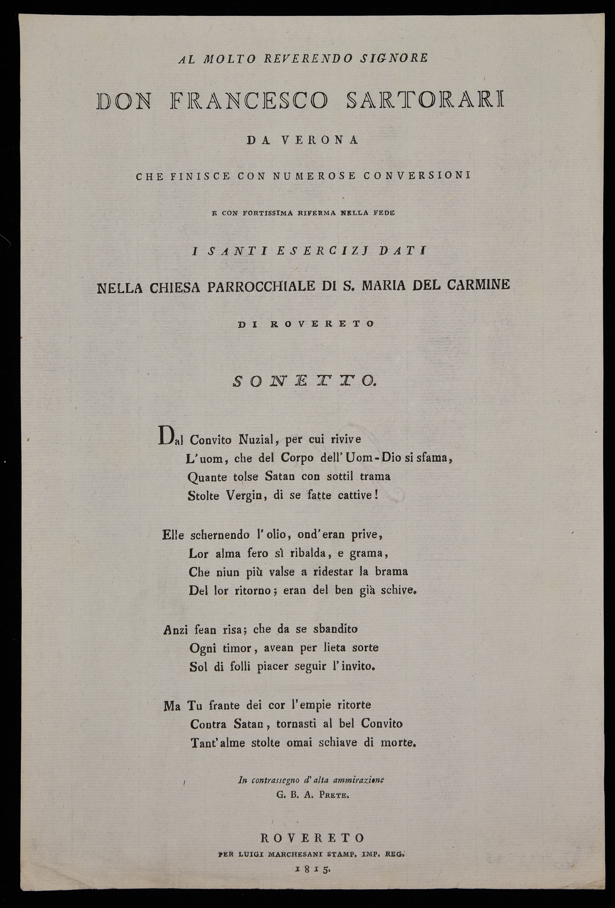 | Al molto reverendo signor don Francesco Sartorari da Verona che finisce con numerose conversioni e con fortissima riferma nella fede i santi esercizi dati nella chiesa parrocchiale di S. Maria del Carmine di Rovereto, sonetto |