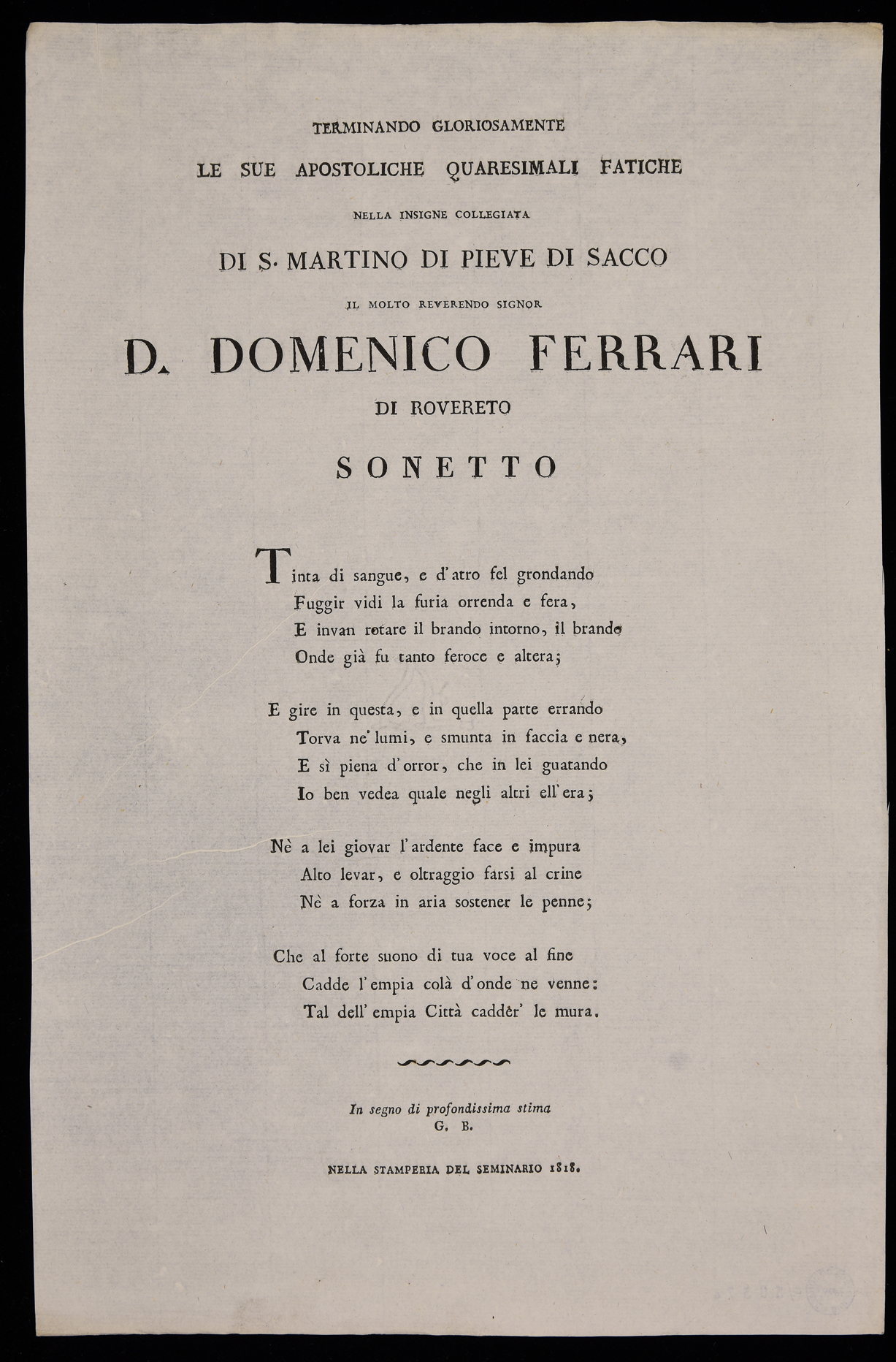 | Terminando gloriosamente le sue apostoliche quaresimali fatiche nella insigne collegiata di S. Martino di Pieve di Sacco il molto reverendo signor d. Domenico Ferrari di Rovereto, sonetto |