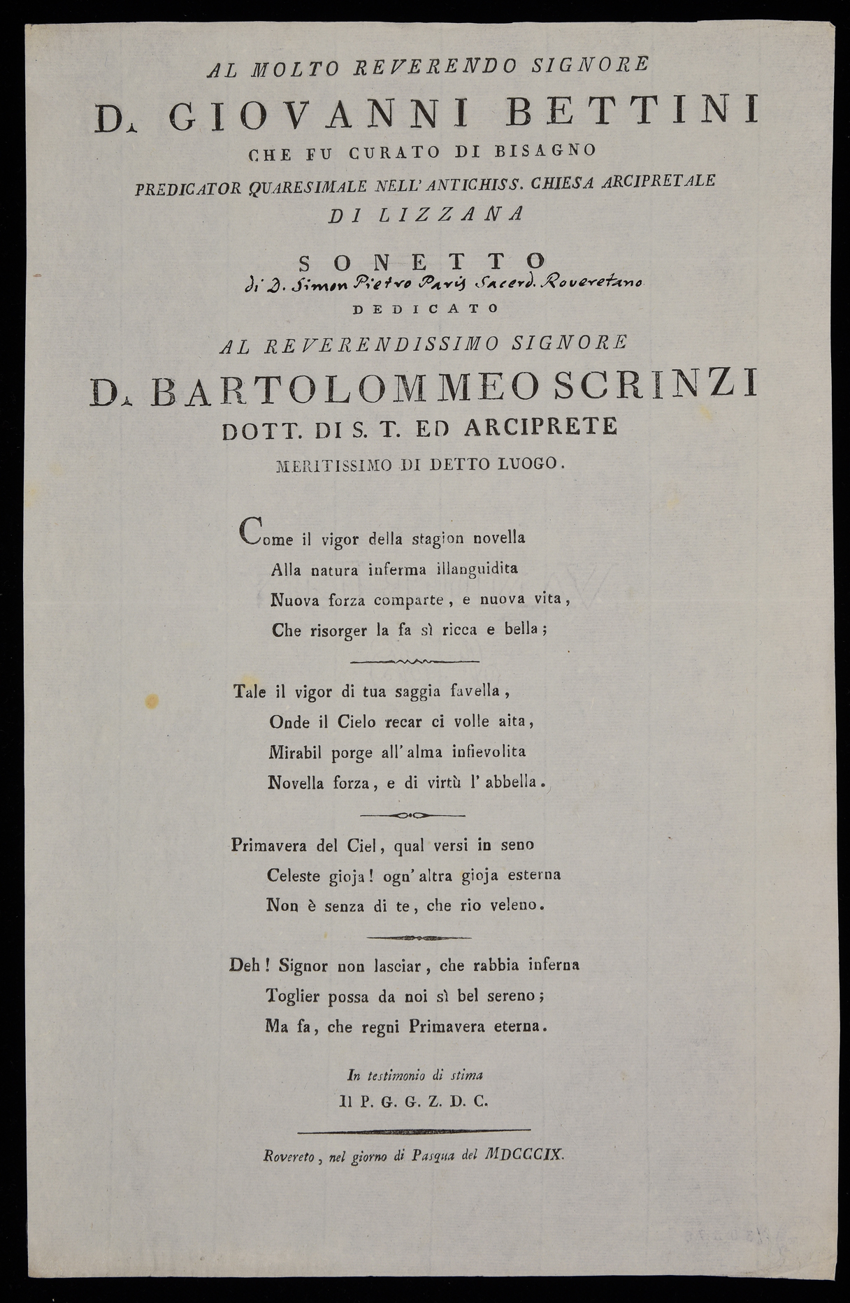 | Al molto reverendo signore d. Giovanni Bettini che fu curato di Bisagno predicator quaresimale nell'antichiss. chiesa arcipretale di Lizzana, sonetto ... |