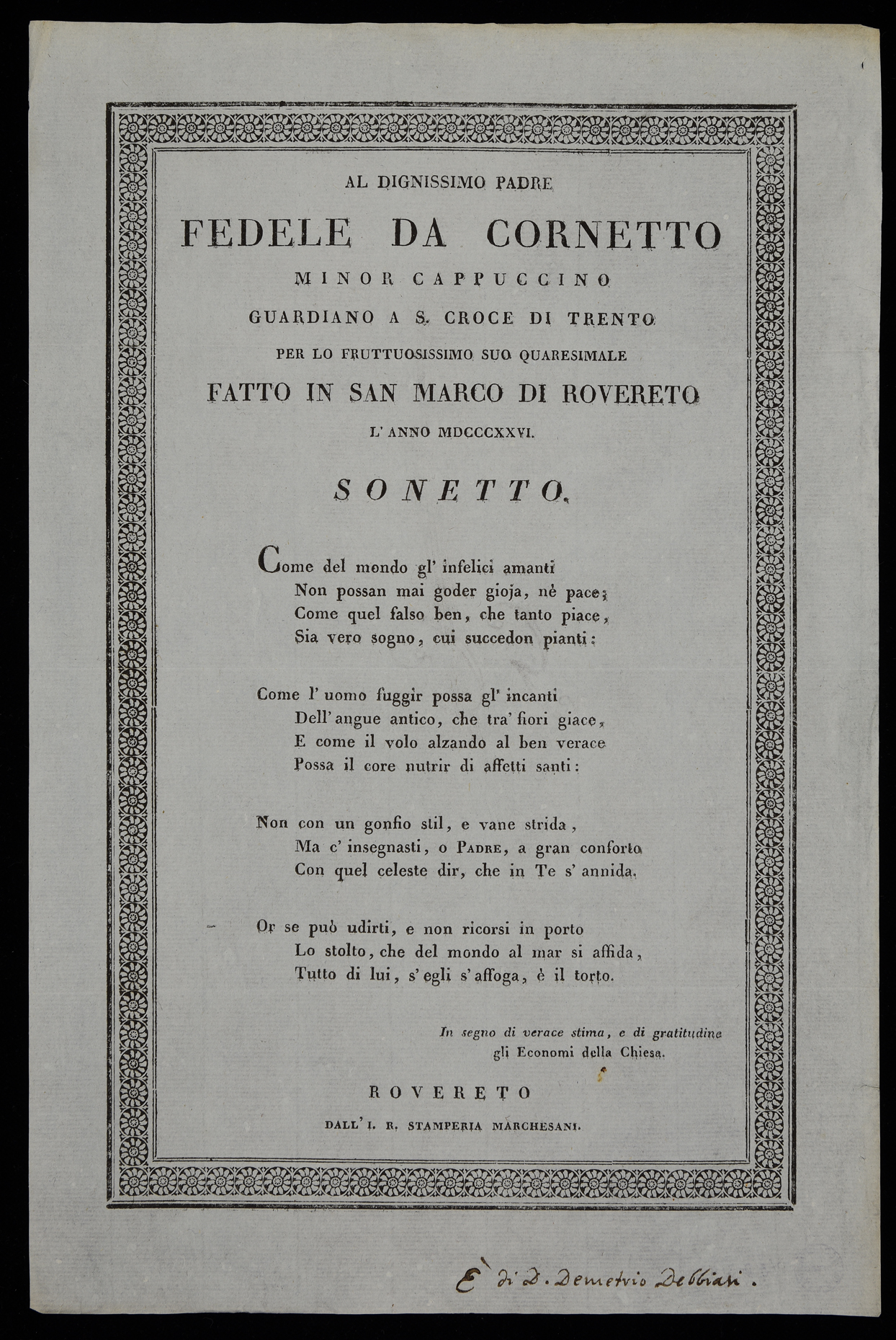 | Al dignissimo padre Fedele da Cornetto, minor cappuccino, guardiano a S. Croce di Trento, per lo fruttuosissimo suo quaresimale fatto in S. Marco di Rovereto l'anno MDCCCXXVI, sonetto |