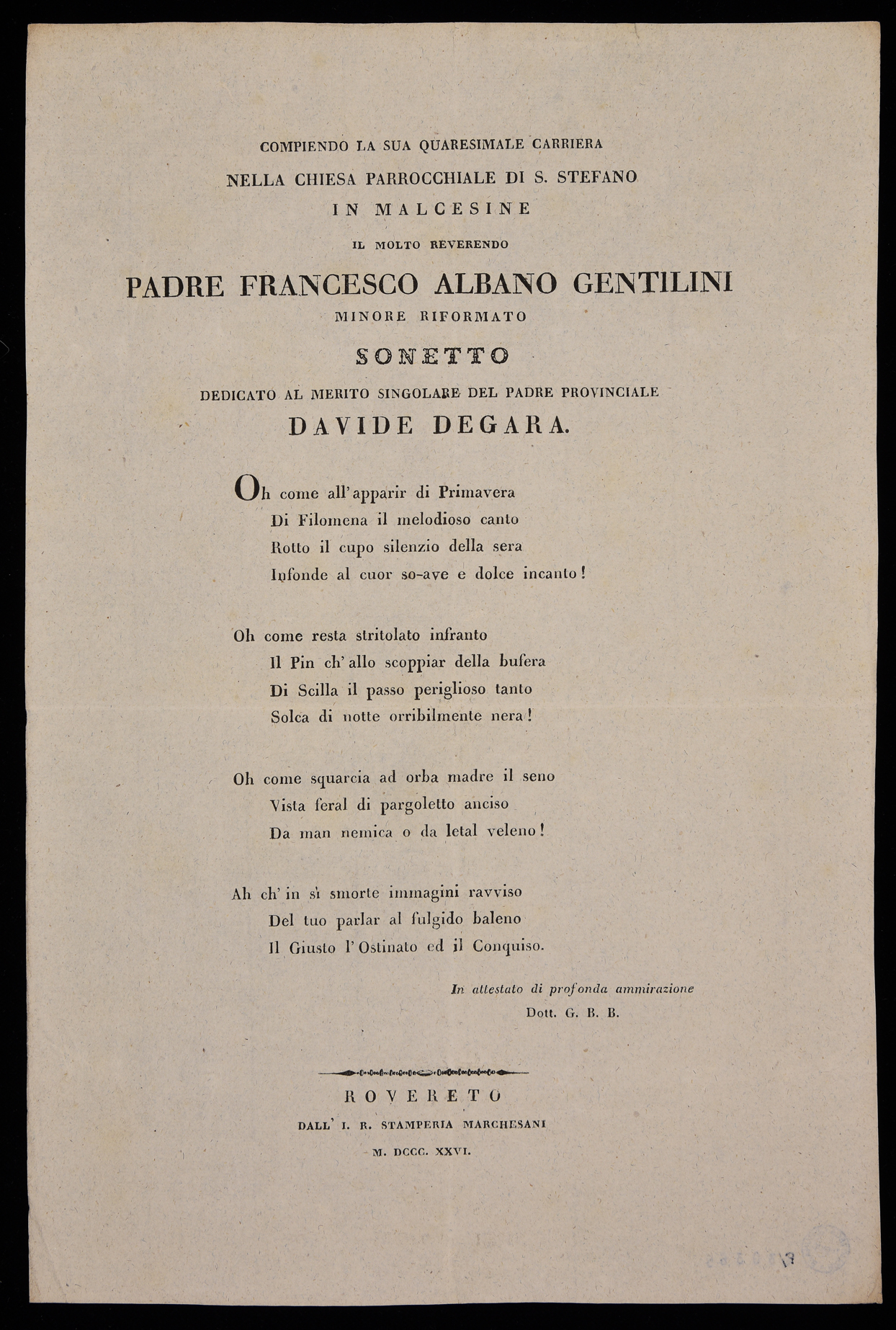 | Compiendo la sua quaresimale carriera nella chiesa parrocchiale di S. Stefano in Malcesine il molto reverendo padre Francesco Albano Gentilini, minore riformato, sonetto dedicato al merito singolare del padre provinciale Davide Degara |