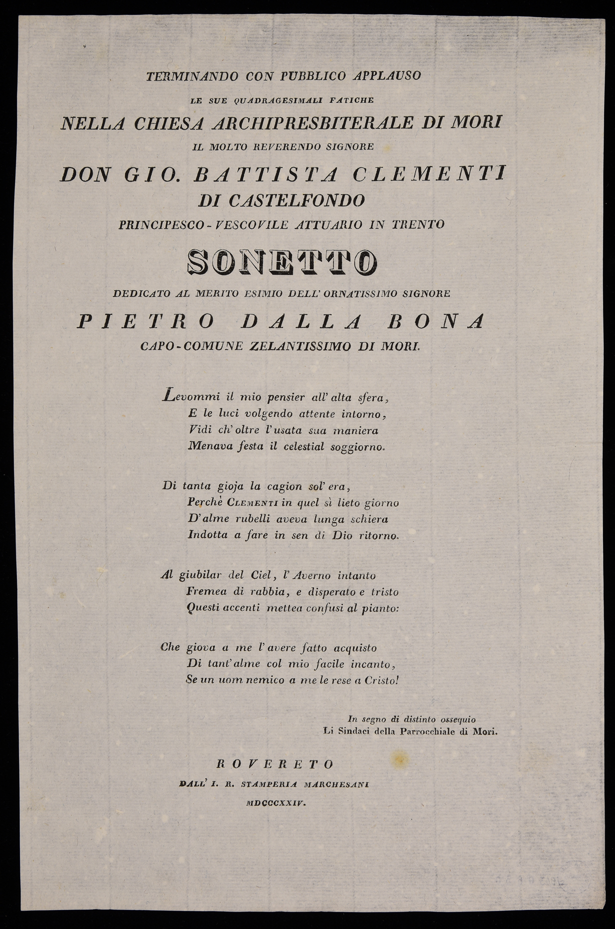 | Terminando con pubblico applauso le sue quadrigesimali fatiche nella chiesa archipresbiterale di Mori il molto reverendo signore don Gio. Battista Clementi di Castelfondo, principesco-vescovile attuario in Trento, sonetto ... |