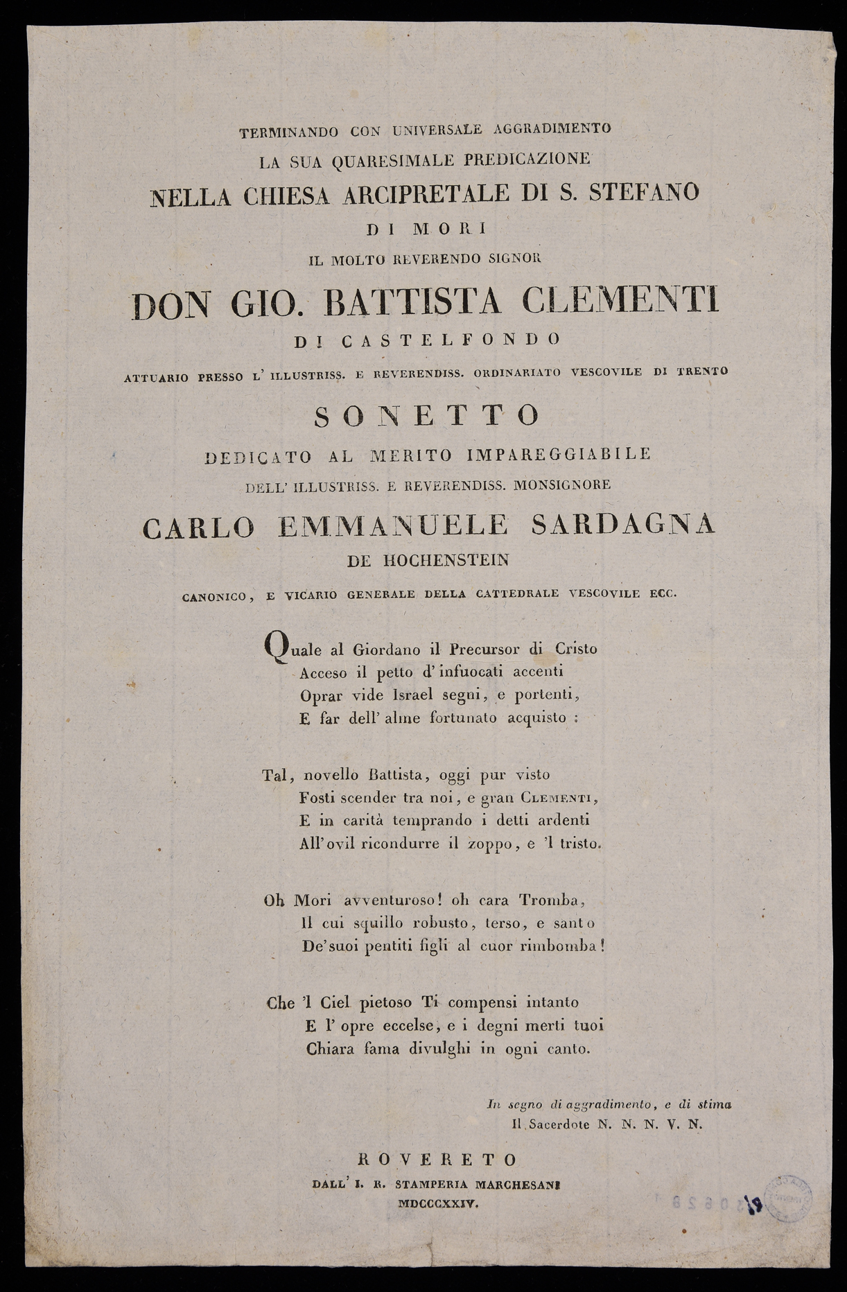 | Terminando con universale aggradimento la sua quaresimale predicazione nella chiesa arcipretale di S. Stefano di Mori il molto reverendo signor Don Gio. Battista Clementi di Castelfondo, attuario presso l'illustriss. e reverendiss. ordinariato vescovile di Trento, sonetto ... |