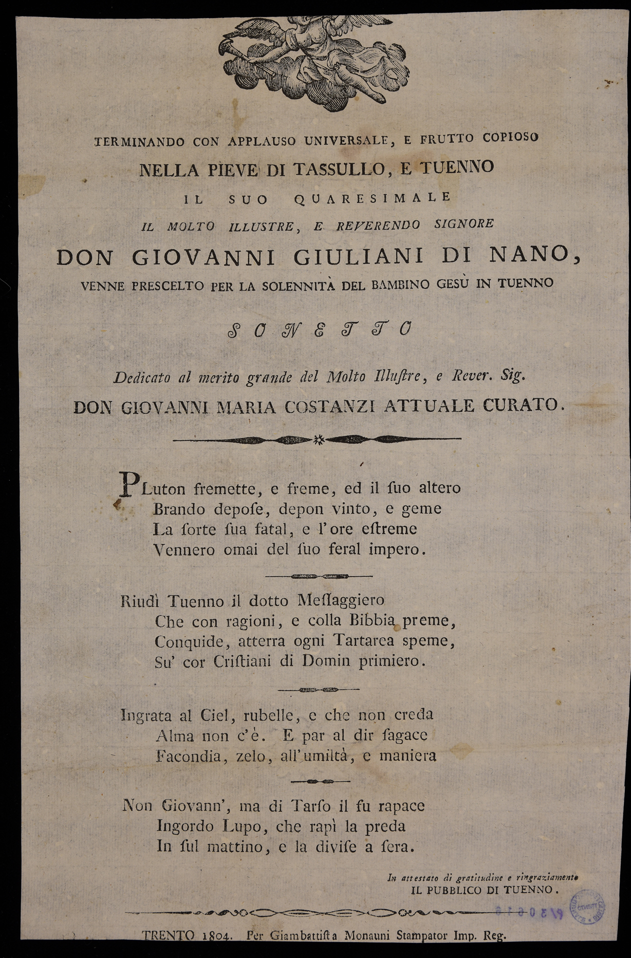 | Terminando con applauso universale, e frutto copioso nella pieve di Tassullo, e Tuenno il suo quaresimale il molto illustre, e reverendo signore don Giovanni Giuliani di Nano ... sonetto dedicato al merito grande del molto illustre, e rever. sig. don Giovanni Maria Costanzi attuale curato |