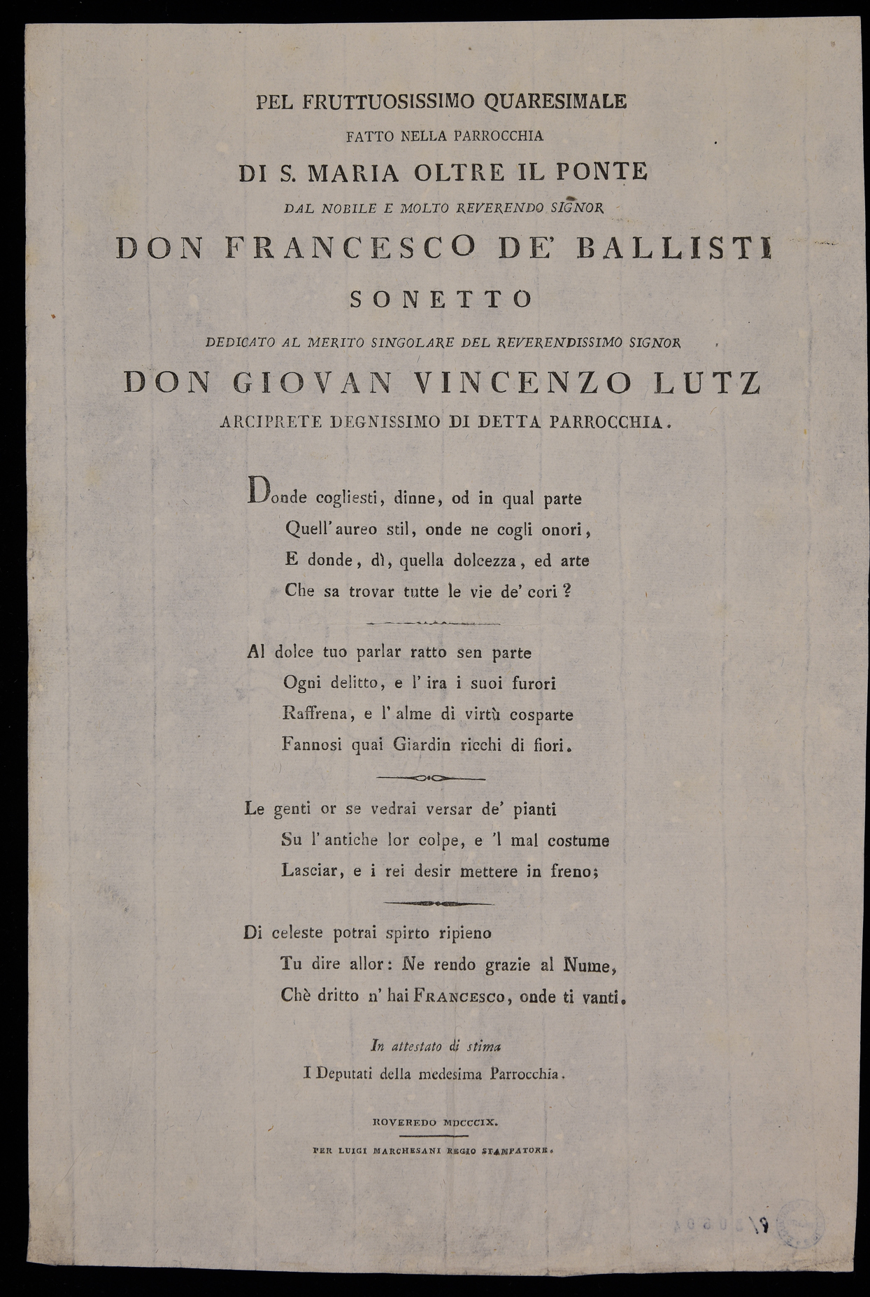 | Pel fruttuosissimo quaresimale fatto nella parrocchia di S. Maria oltre il ponte dal nobile e molto reverendo signor don Francesco de' Ballisti, sonetto ... |