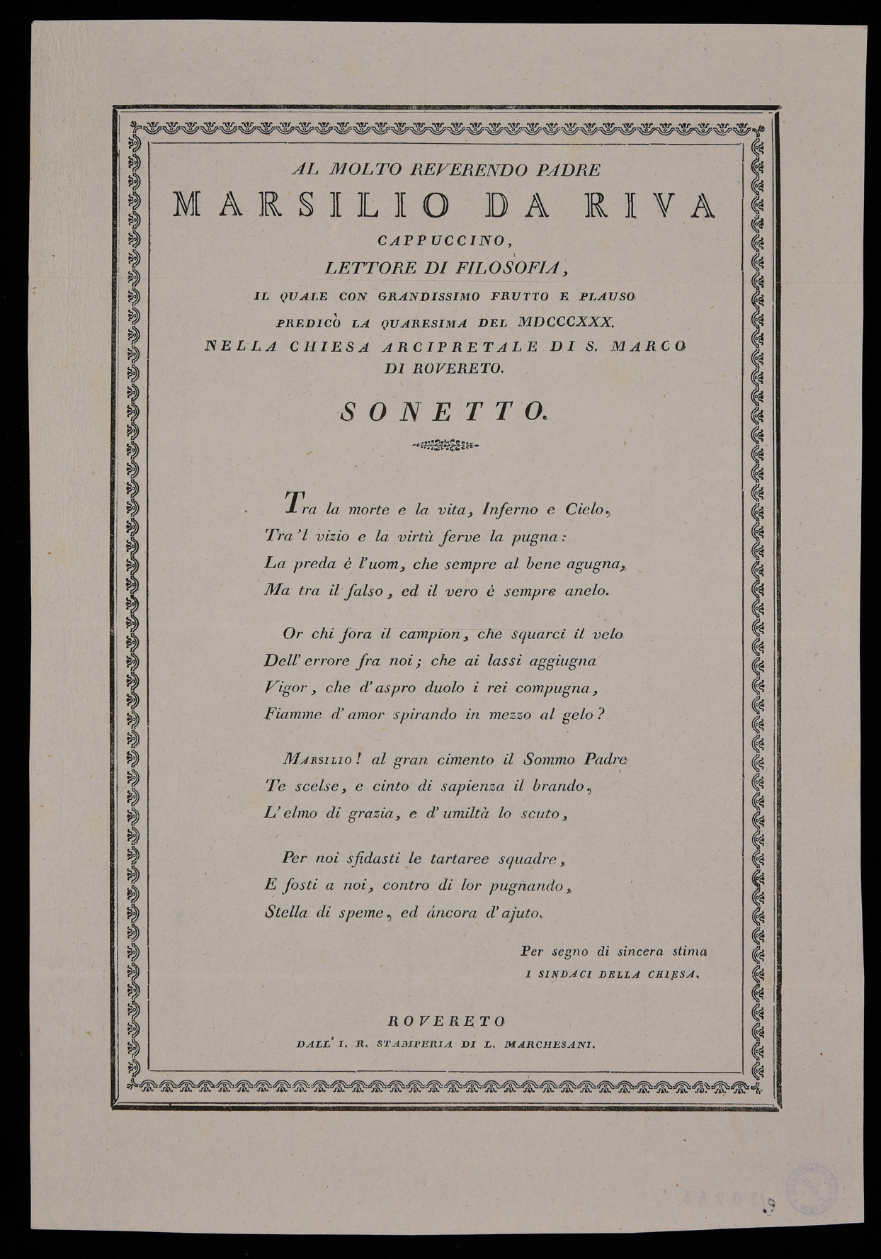 | Al molto reverendo padre Marsilio da Riva cappuccino, lettore di filosofia, il quale con grandissimo frutto e plauso predicò la quaresima del MDCCCXXX. nella chiesa arcipretale di S. Marco di Rovereto, sonetto |