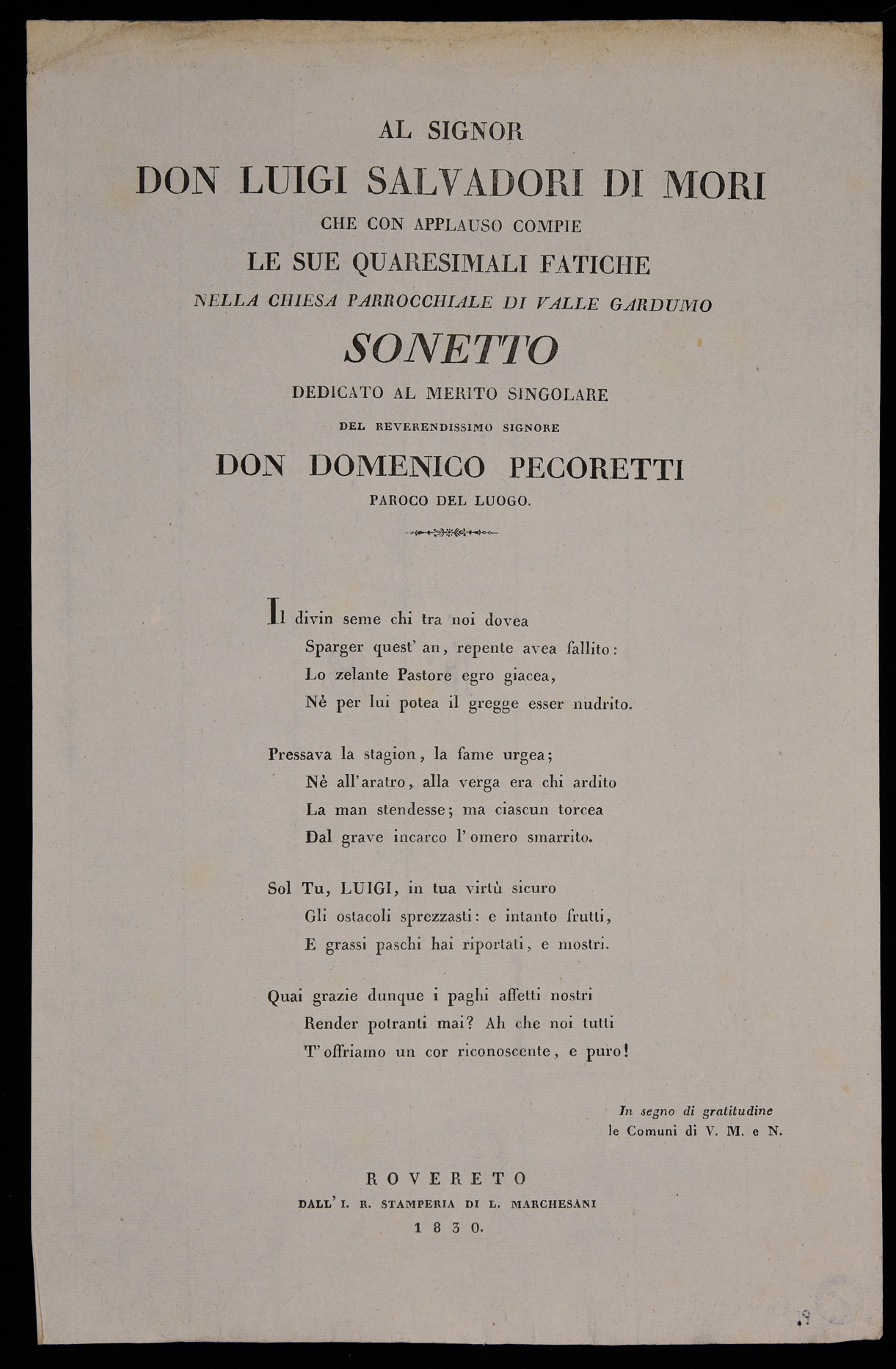 | Al signor Luigi Salvadori di Mori che con applauso compie le sue quaresimali fatiche nella chiesa parrocchiale di Valle Gardumo, sonetto dedicato al merito singolare del reverendissimo signore don Domenico Pecoretti paroco del luogo |