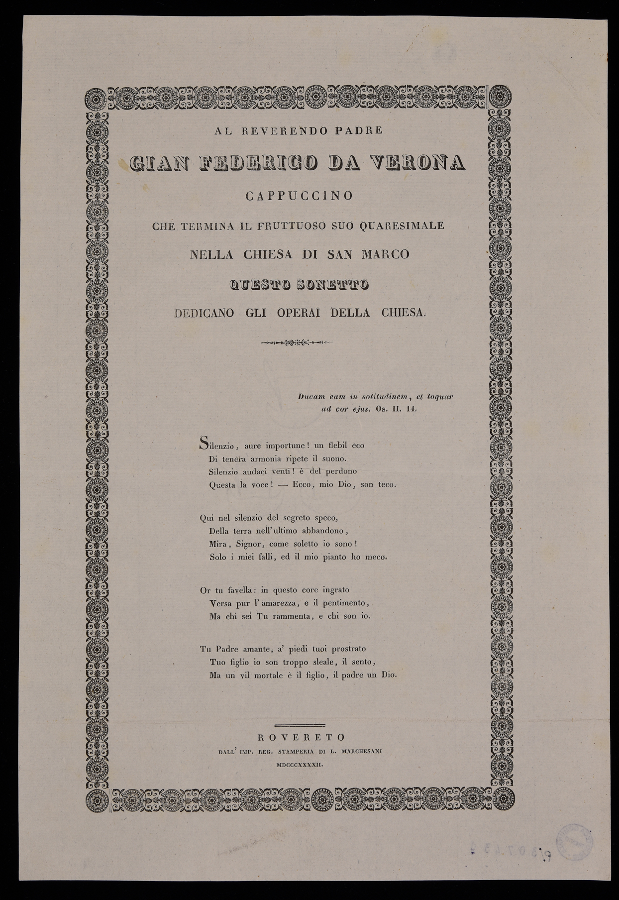 | Al reverendo padre Gian Federico da Verona cappuccino che termina il fruttuoso suo quaresimale nella chiesa di San Marco, questo sonetto dedicano gli operai della chiesa |