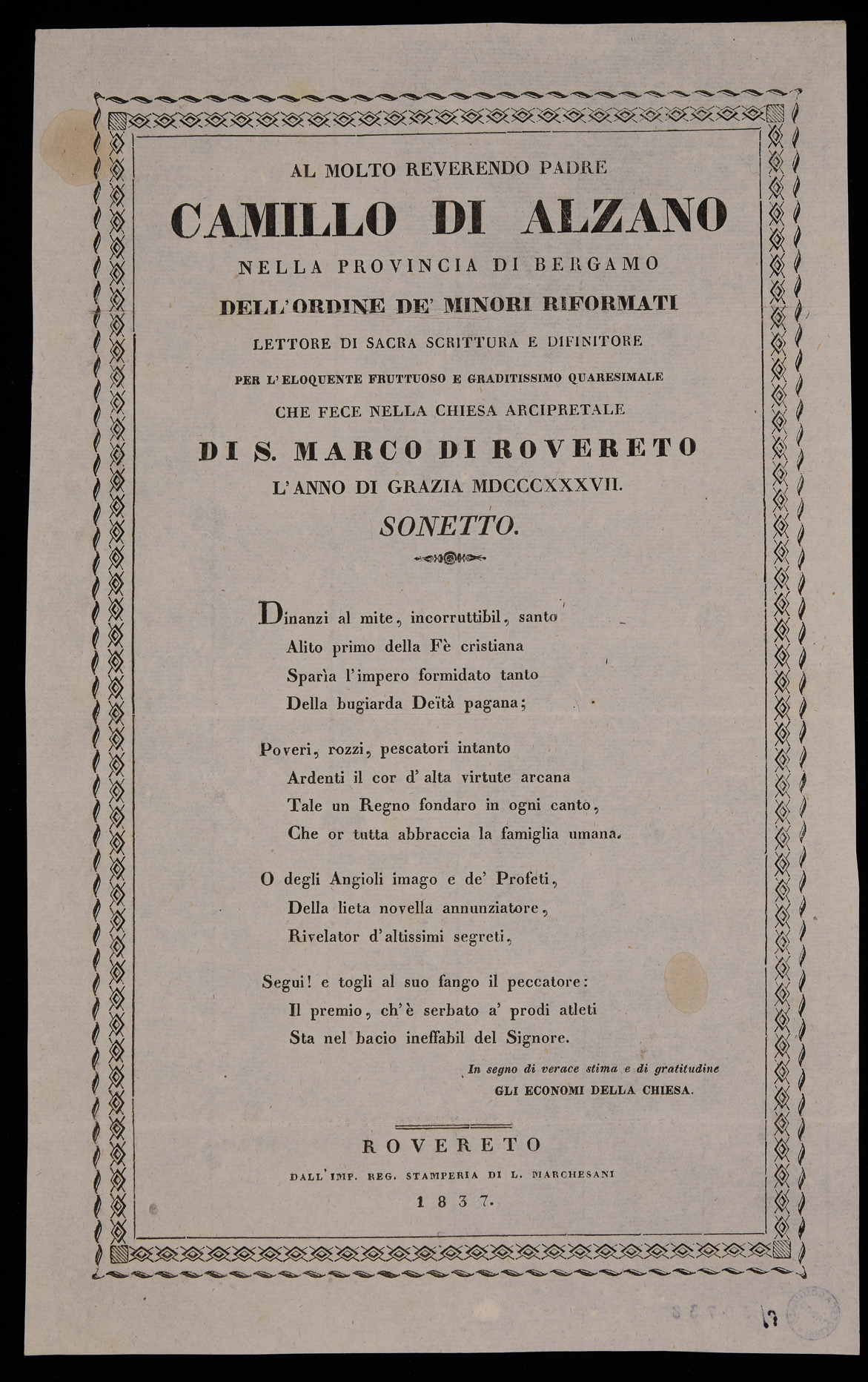 | Al molto reverendo padre Camillo di Alzano nella provincia di Bergamo dell'ordine de' minori riformati ... sonetto |