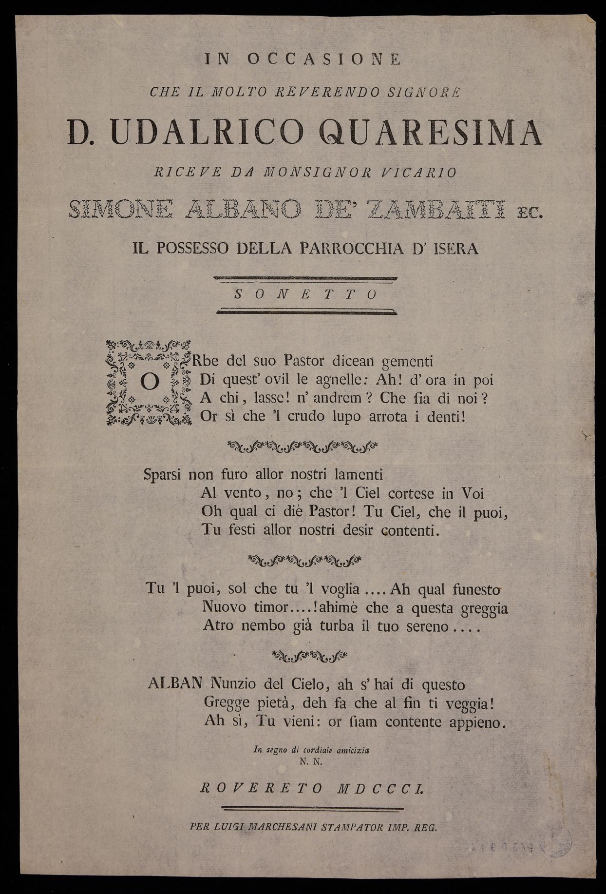 | In occasione che il molto reverendo signore d. Udalrico Quaresima riceve ... il possesso della parrocchia d'Isera, sonetto |