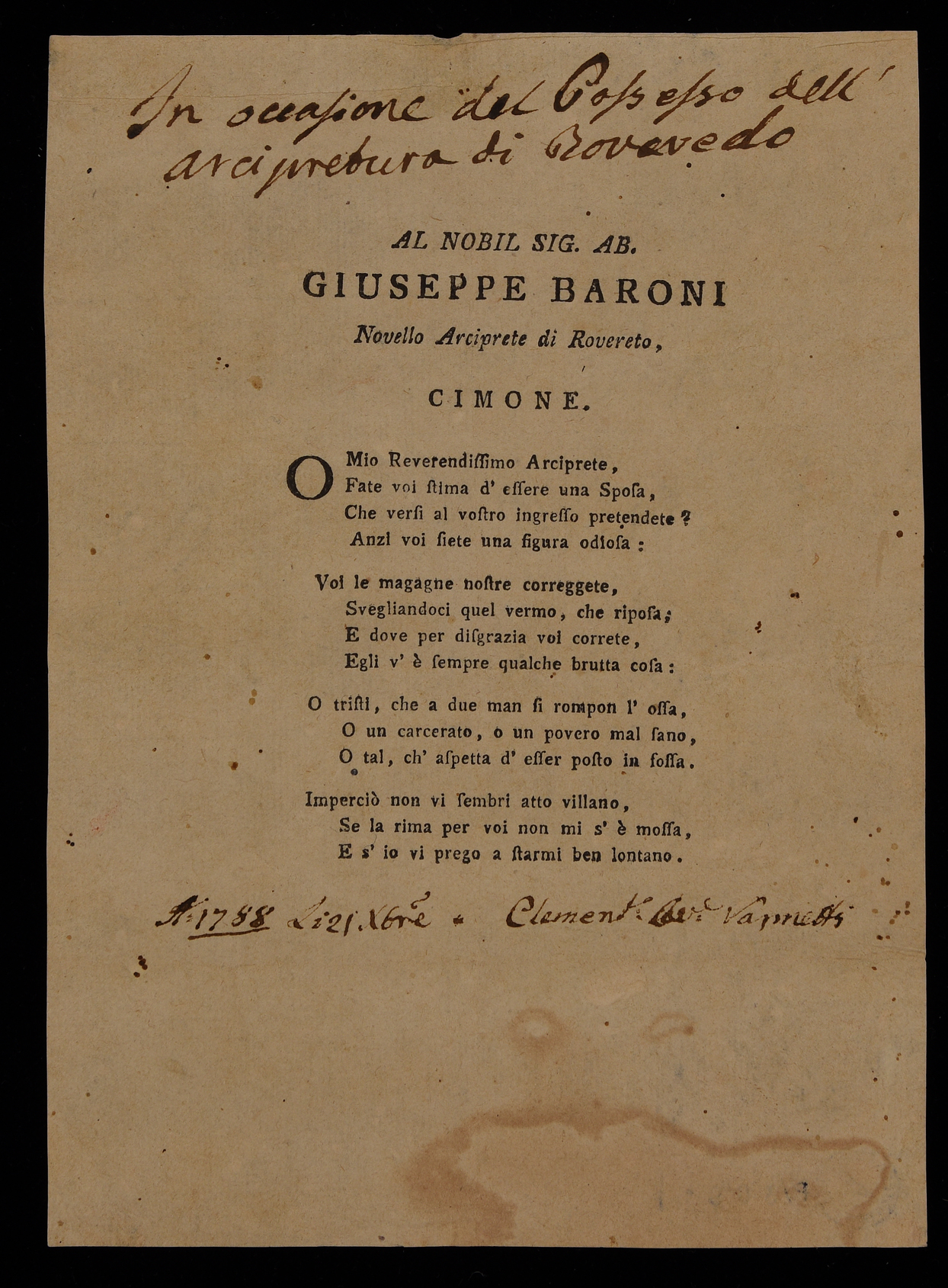 | Al nobil sig. ab. Giuseppe Baroni novello arciprete di Rovereto, cimone |