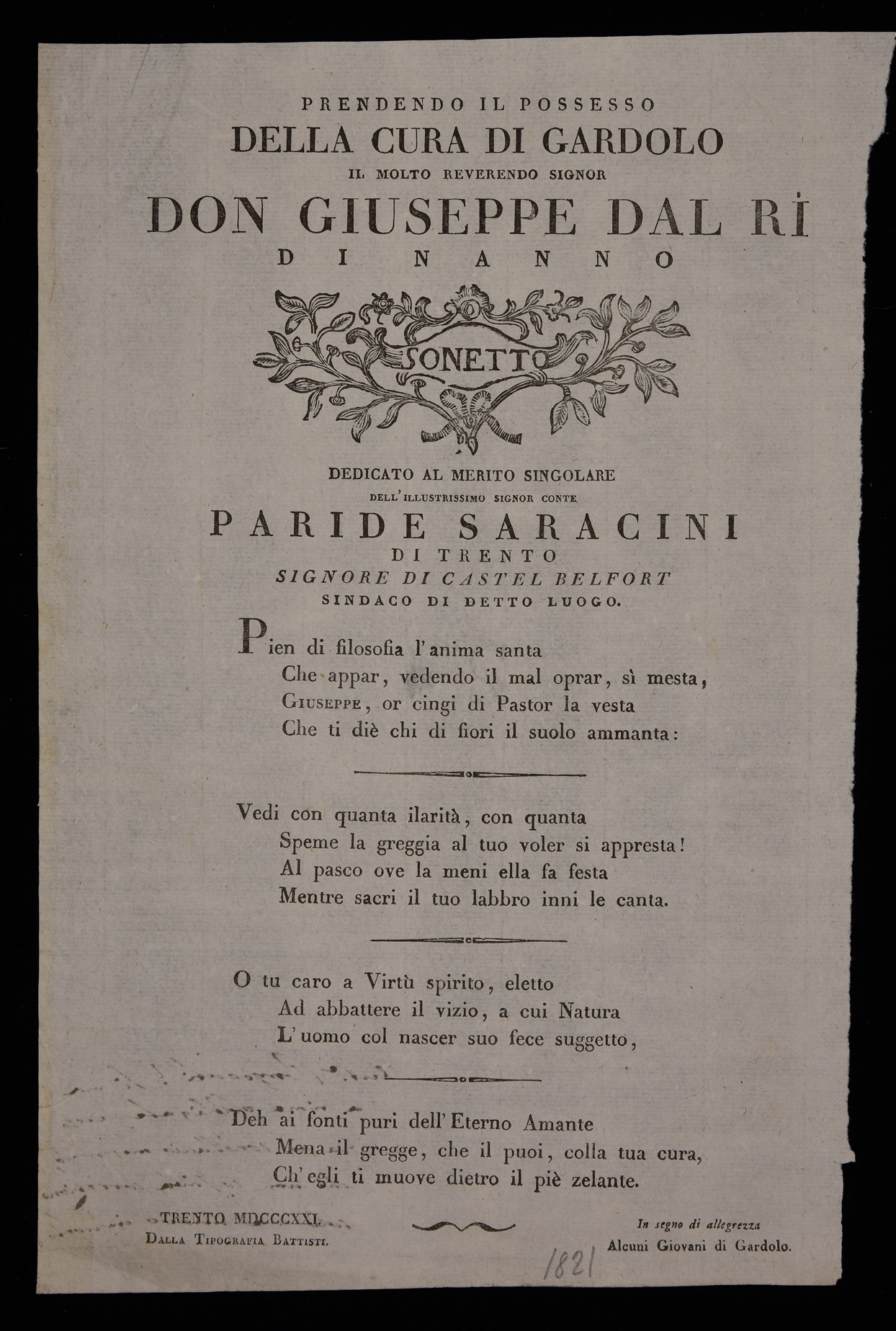 | Prendendo il possesso della cura di Gardolo il molto reverendo signor don Giuseppe Dal Rì di Nanno, sonetto ... |