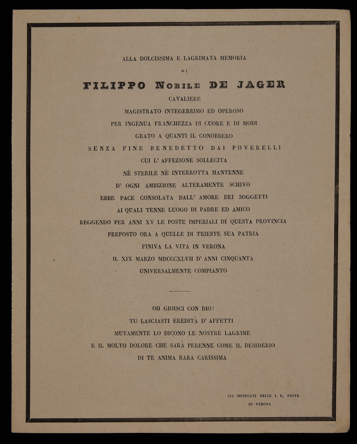 | Alla dolcissima e lagrimata memoria di Filippo nobile de Jager cavaliere magistrato integerrimo ed operoso ... |