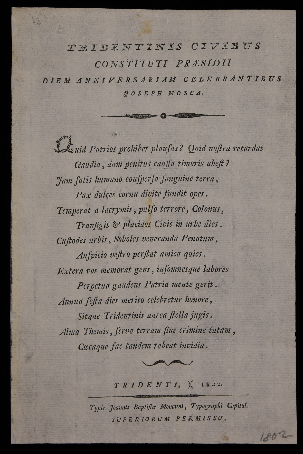 | Tridentinis civibus constituti praesidii diem anniversariam celebrantibus Joseph Mosca |