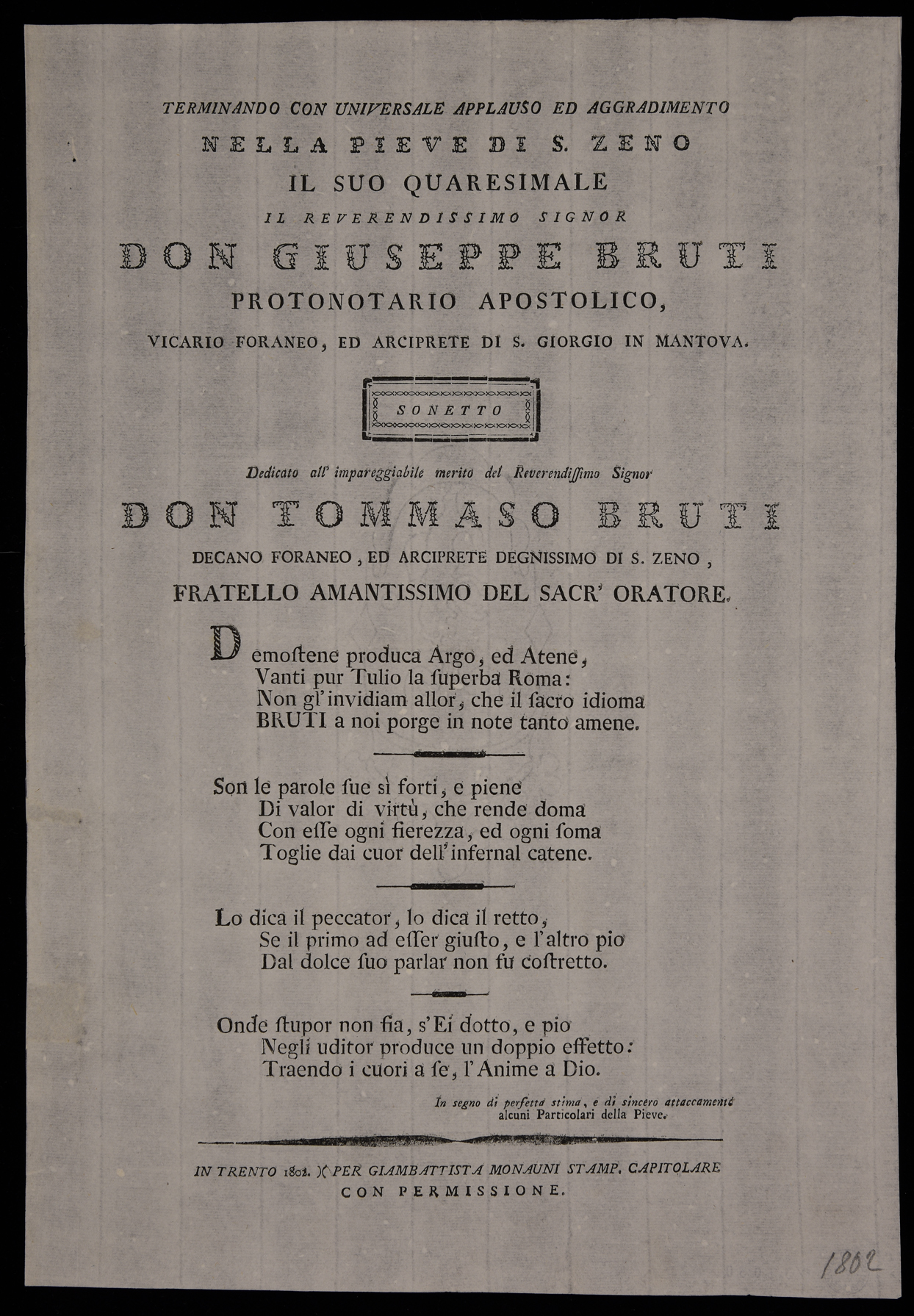 | Terminando con universale applauso ed aggradimento nella pieve di S. Zeno il suo quaresimale il reverendissimo signor don Giuseppe Bruti ... sonetto ... |