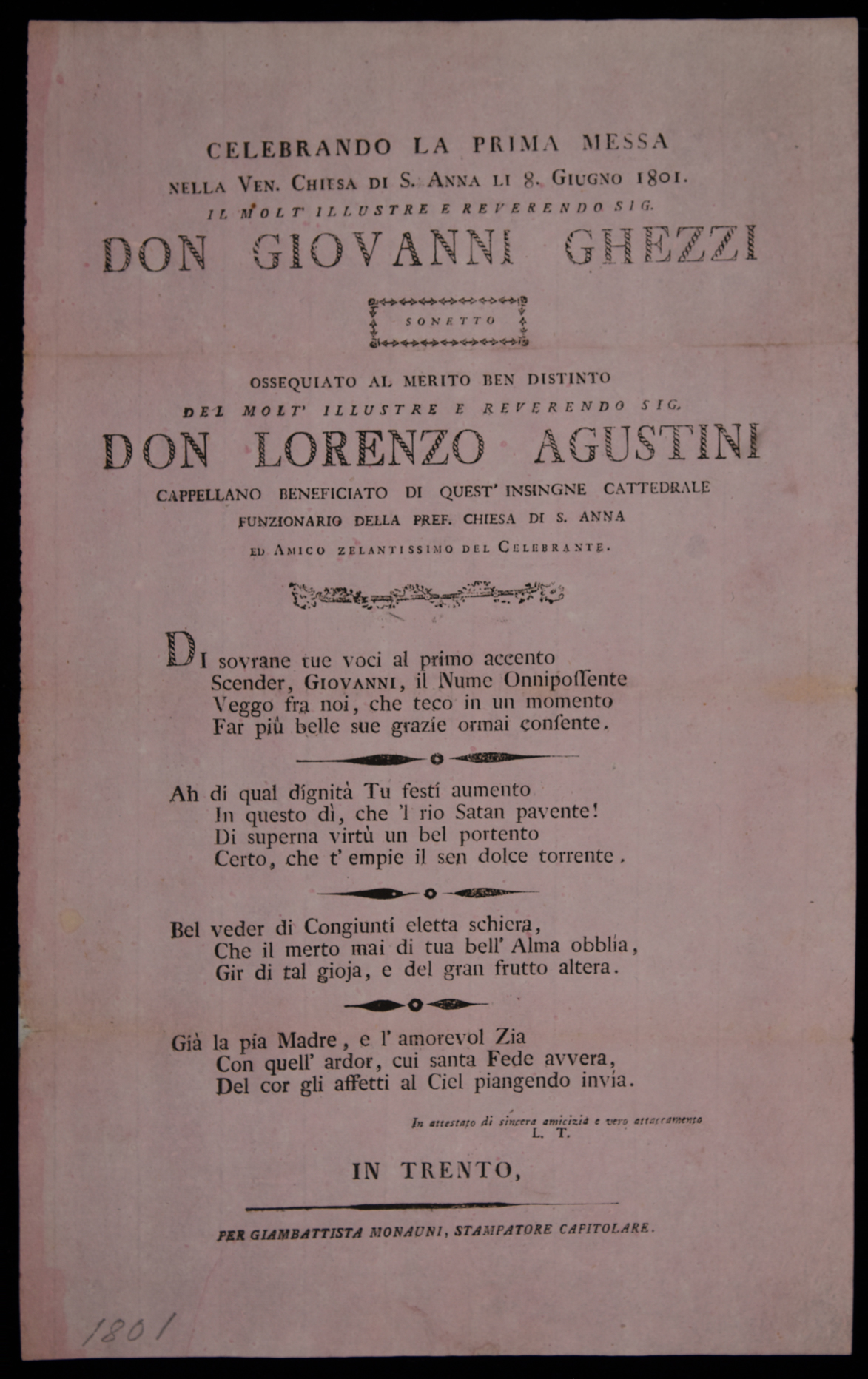 | Celebrando la prima messa nella ven. chiesa di S. Anna li 8. giugno 1801. il molt'illustre e reverendo sig. don Giovanni Ghezzi, sonetto ... |