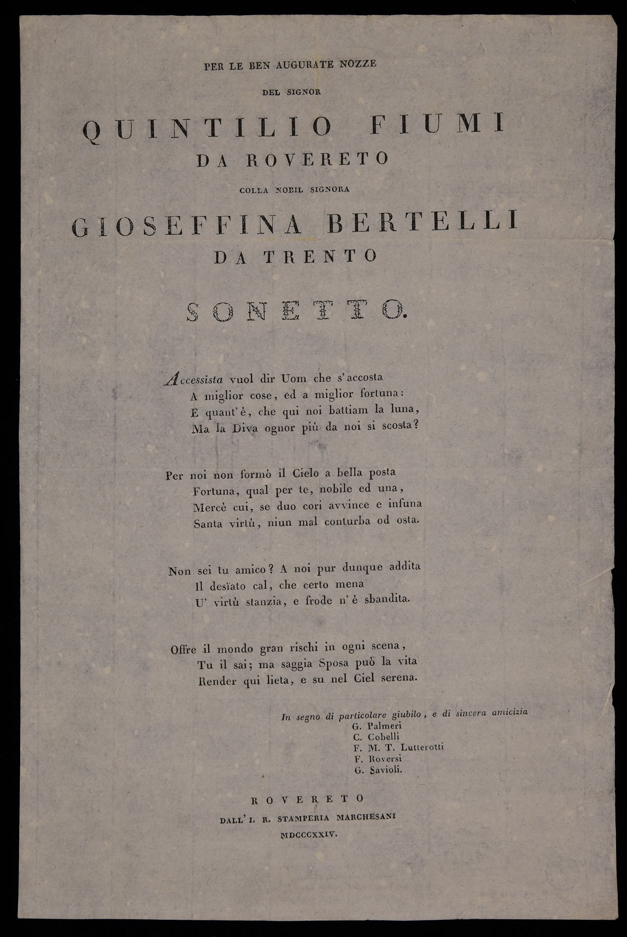 | Per le ben augurate nozze del signor Quintilio Fiumi da Rovereto colla nobil signora Gioseffina Bertelli da Trento, sonetto |