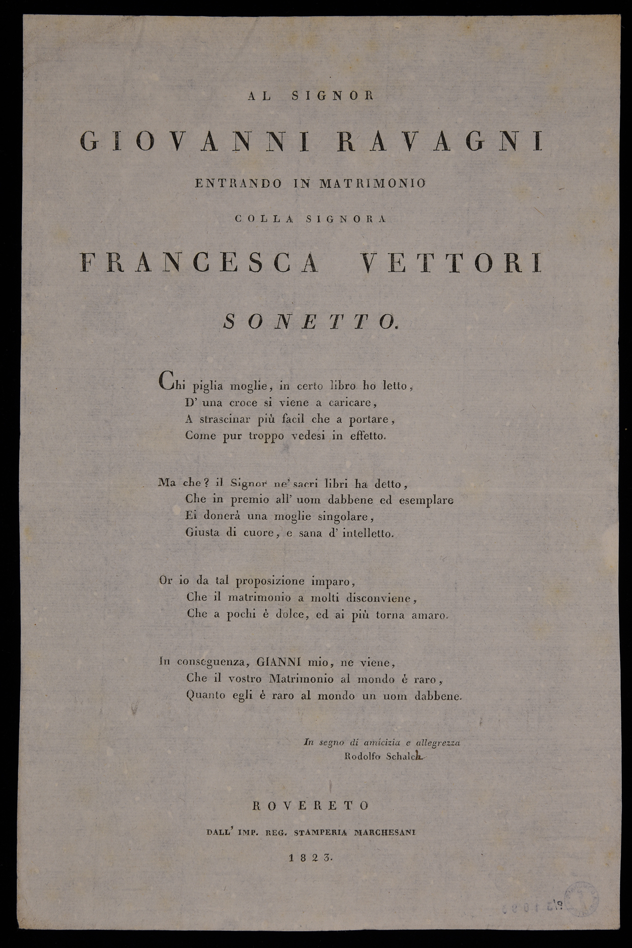 Al signor Giovanni Ravagni entrando in matrimonio colla signora Francesca...