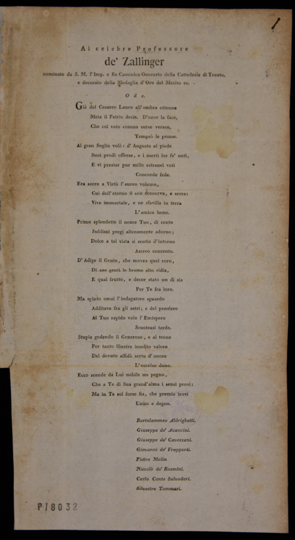 | Al celebre professore de' Zallinger nominato da S.M. l'imp. e re canonico onorario della cattedrale di Trento ... ode |