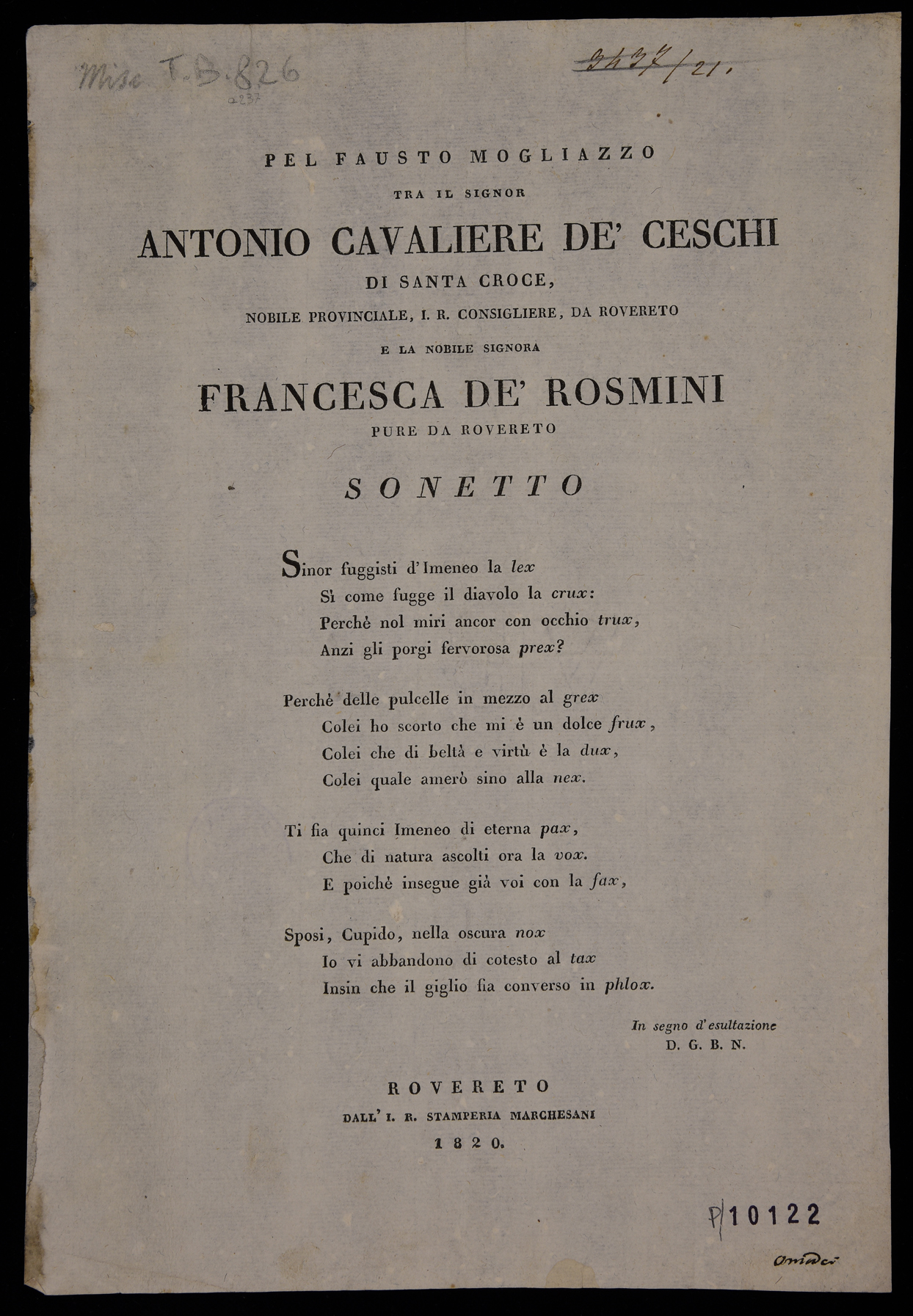 | Pel fausto mogliazzo tra il signor Antonio cavaliere de' Ceschi di Santa Croce ... e la nobile signora Francesca de' Rosmini pure da Rovereto, sonetto |