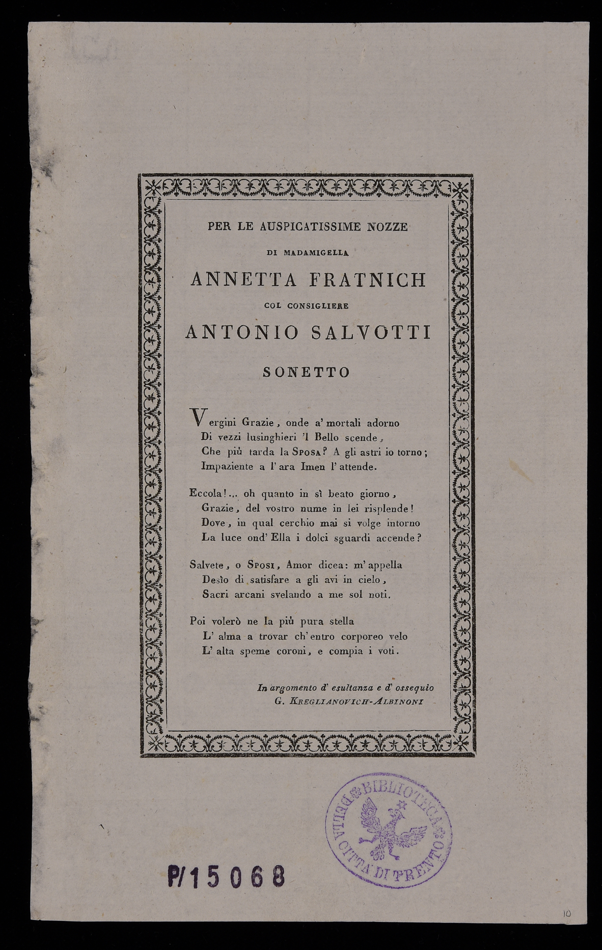 | Per le auspicatissime nozze di madamigella Annetta Fratnich col consigliere Antonio Salvotti, sonetto |