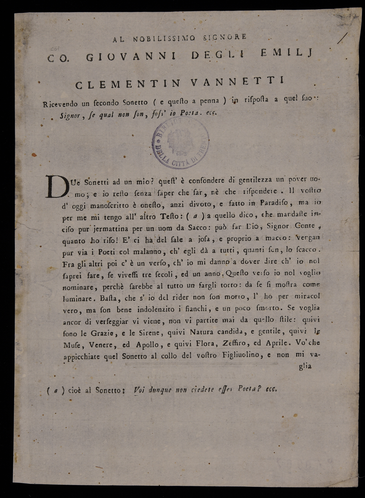 | Al nobilissimo signore co. Giovanni degli Emilj Clementin Vannetti ricevendo un secondo sonetto ... in risposta a quel suo ... |