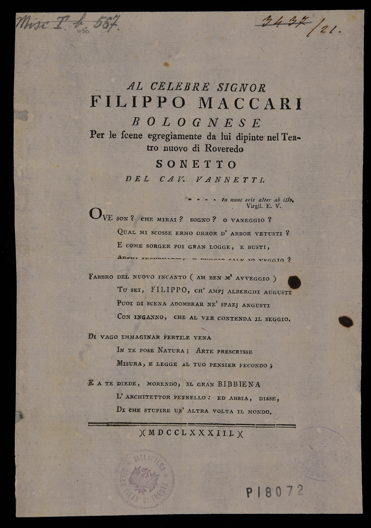 | Al celebre signor Filippo Maccari bolognese per le scene egregiamente da lui dipinte nel Teatro nuovo di Roveredo, sonetto del cav. Vannetti |