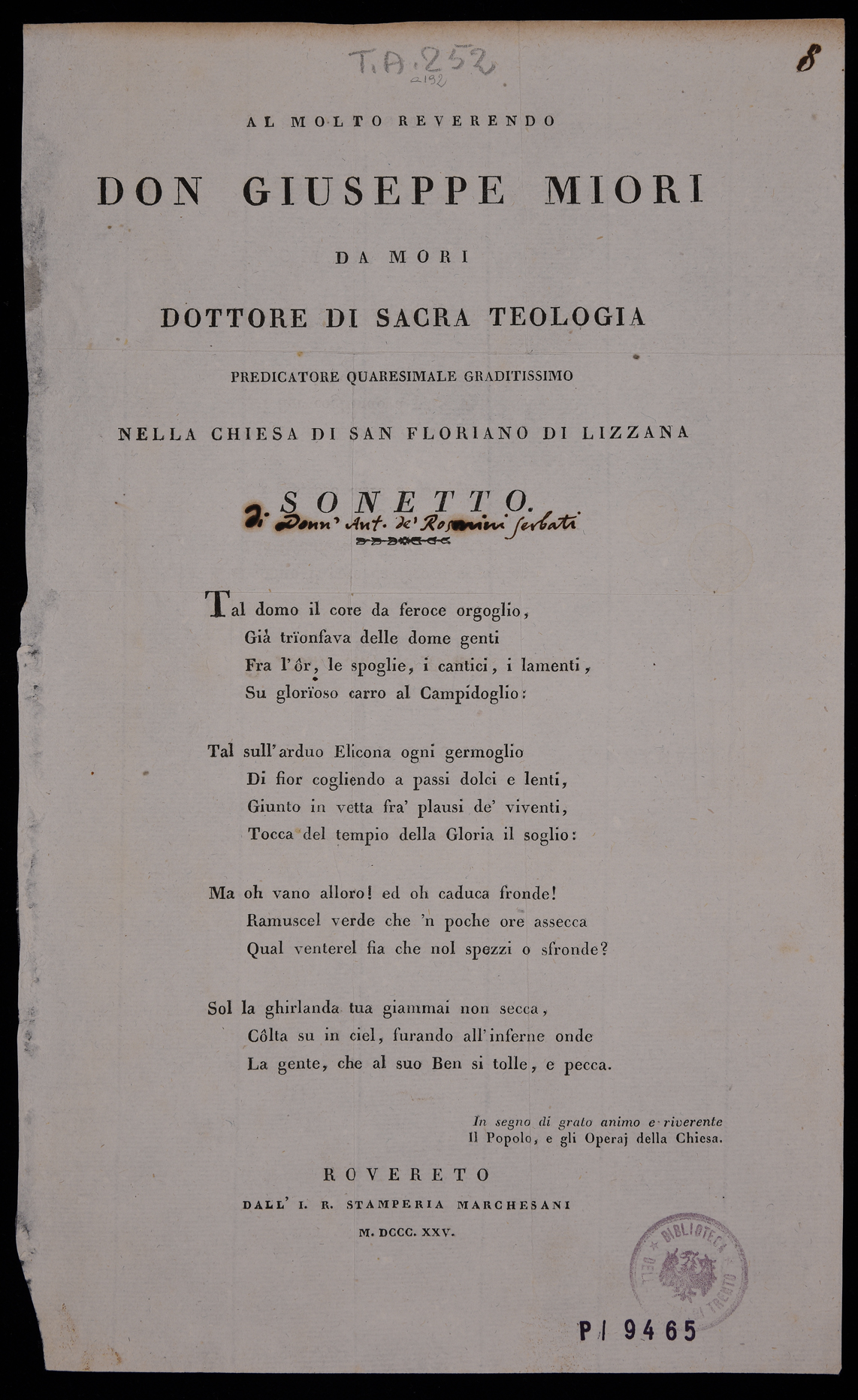 | Al molto reverendo don Giuseppe Miori da Mori dottore in sacra teologia predicatore quaresimale graditissimo nella chiesa di san Floriano di Lizzana, sonetto |
