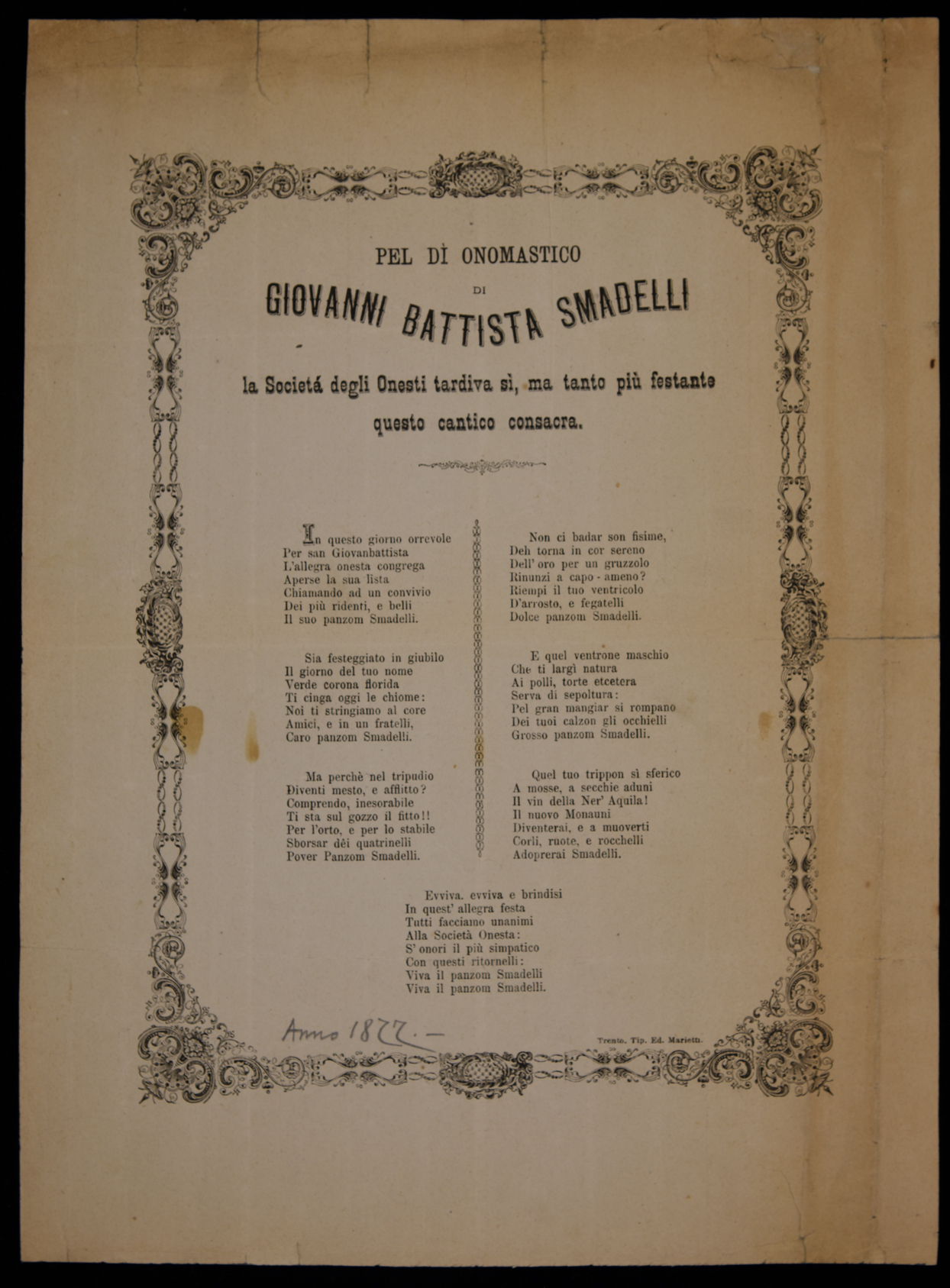 Pel dì onomastico di Giovanni Battista Smadelli la Società degli Onesti...
