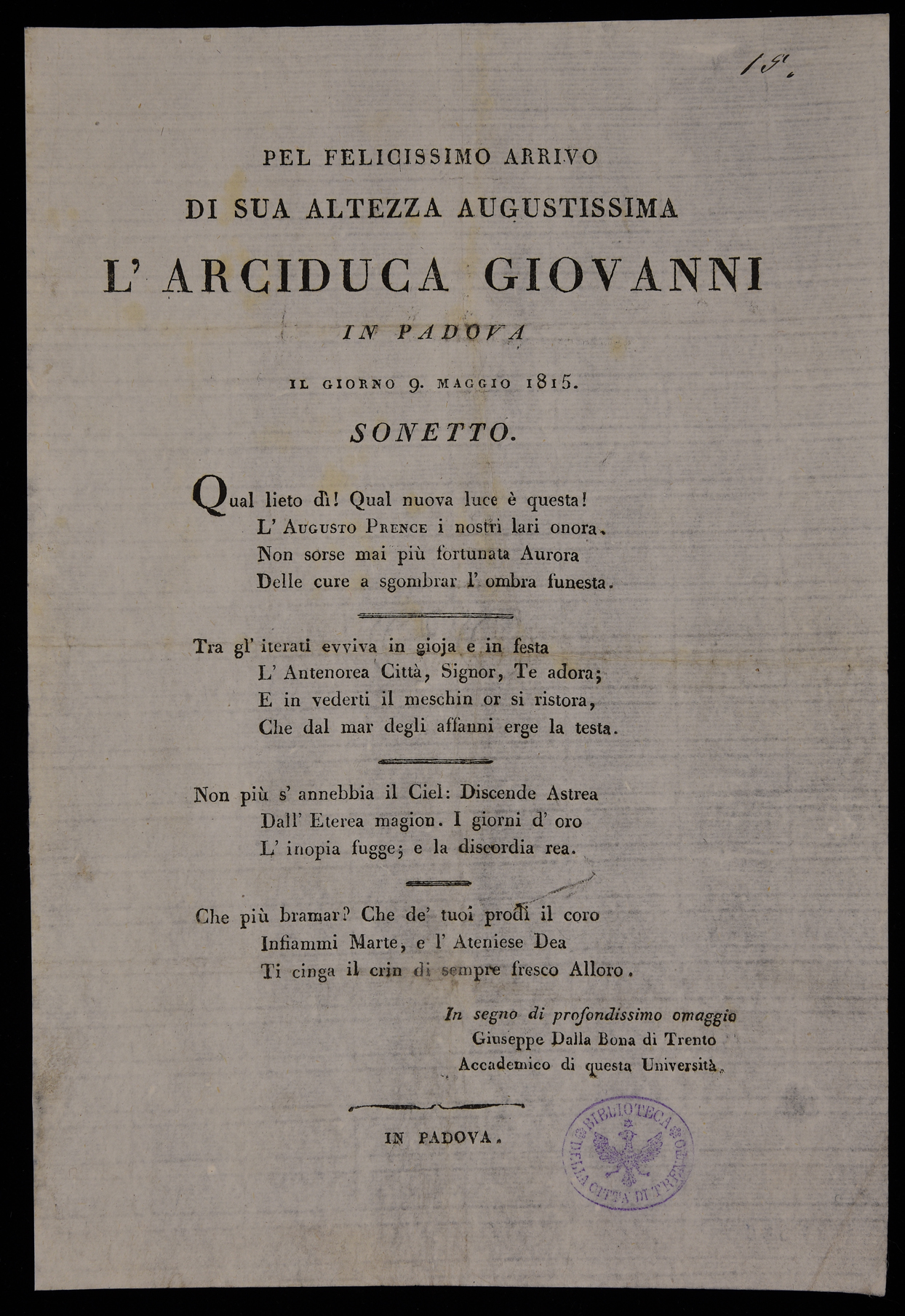 | Pel felicissimo arrivo di sua altezza augustissima l'arciduca Giovanni in Padova il giorno 9. maggio 1815., sonetto |