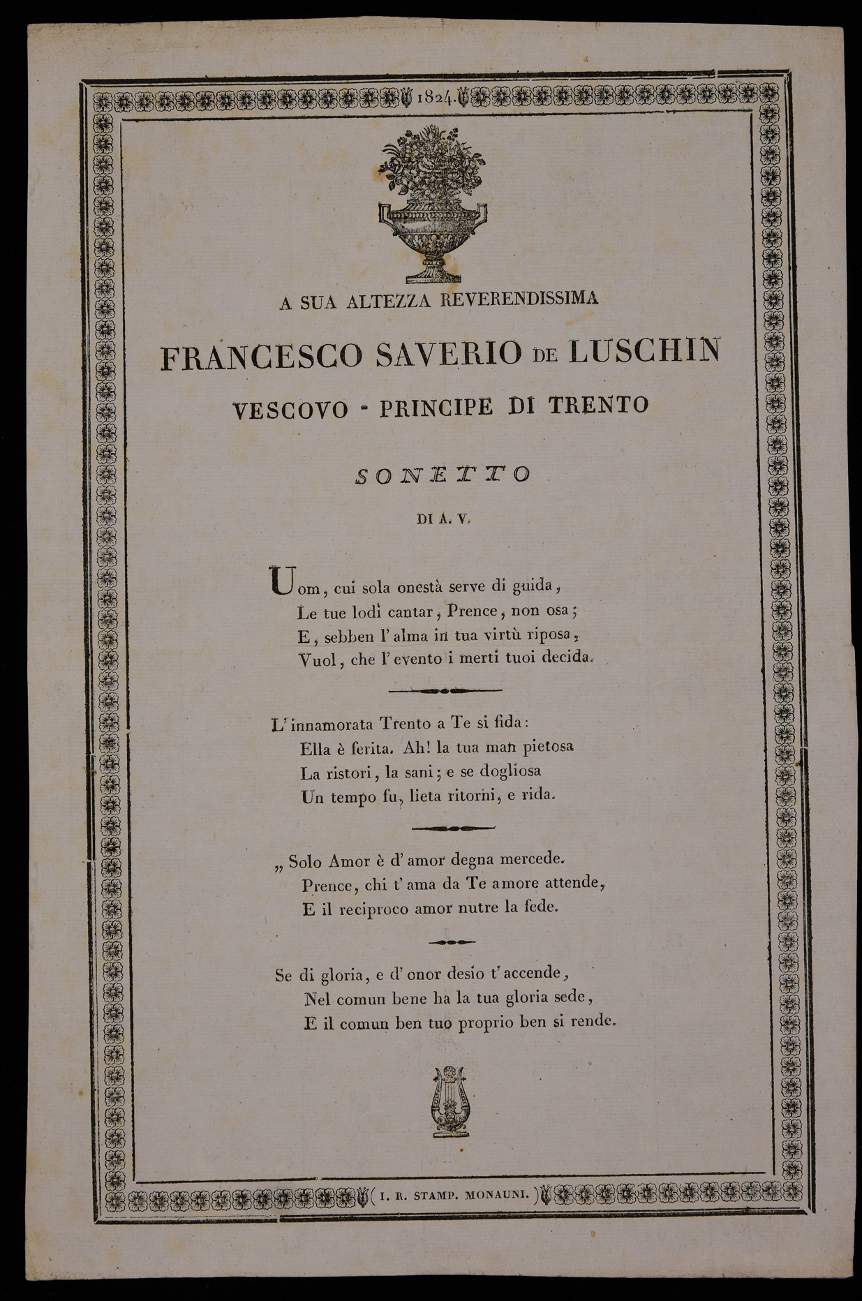 | A sua altezza reverendissima Francesco Saverio de Luschin vescovo-principe di Trento, sonetto di A.V. |
