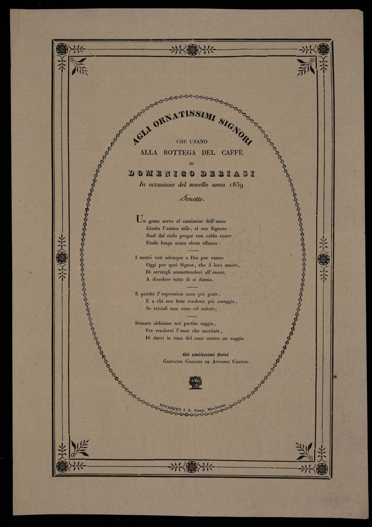 | Agli ornatissimi signori che usano alla bottega del caffè di Domenico Debiasi in occasione del novello anno 1839, sonetto |